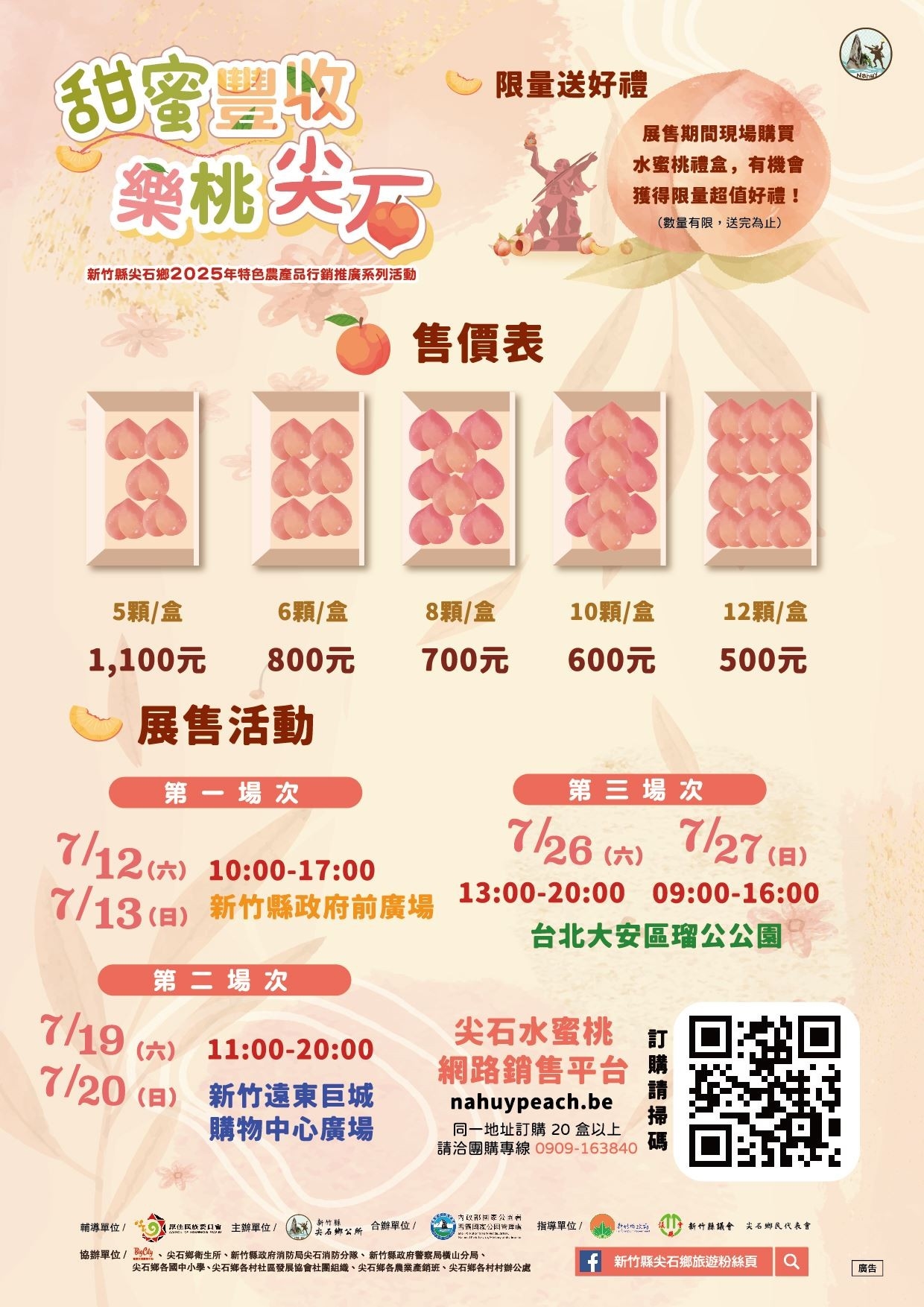 尖石鄉公所今年持續推動「甜蜜豐收 樂桃尖石」行銷推廣,今、明(12、13日)2天於縣府前廣場舉辦展實體展售會,接續還有2場次展售活動,將前往巨城購物中心、台北市東區瑠公公園,推廣尖石水蜜桃。活動期間於現場購買水蜜桃禮盒,就有機會獲得限量贈禮與趣味互動,歡迎大眾優先選購在地生產
