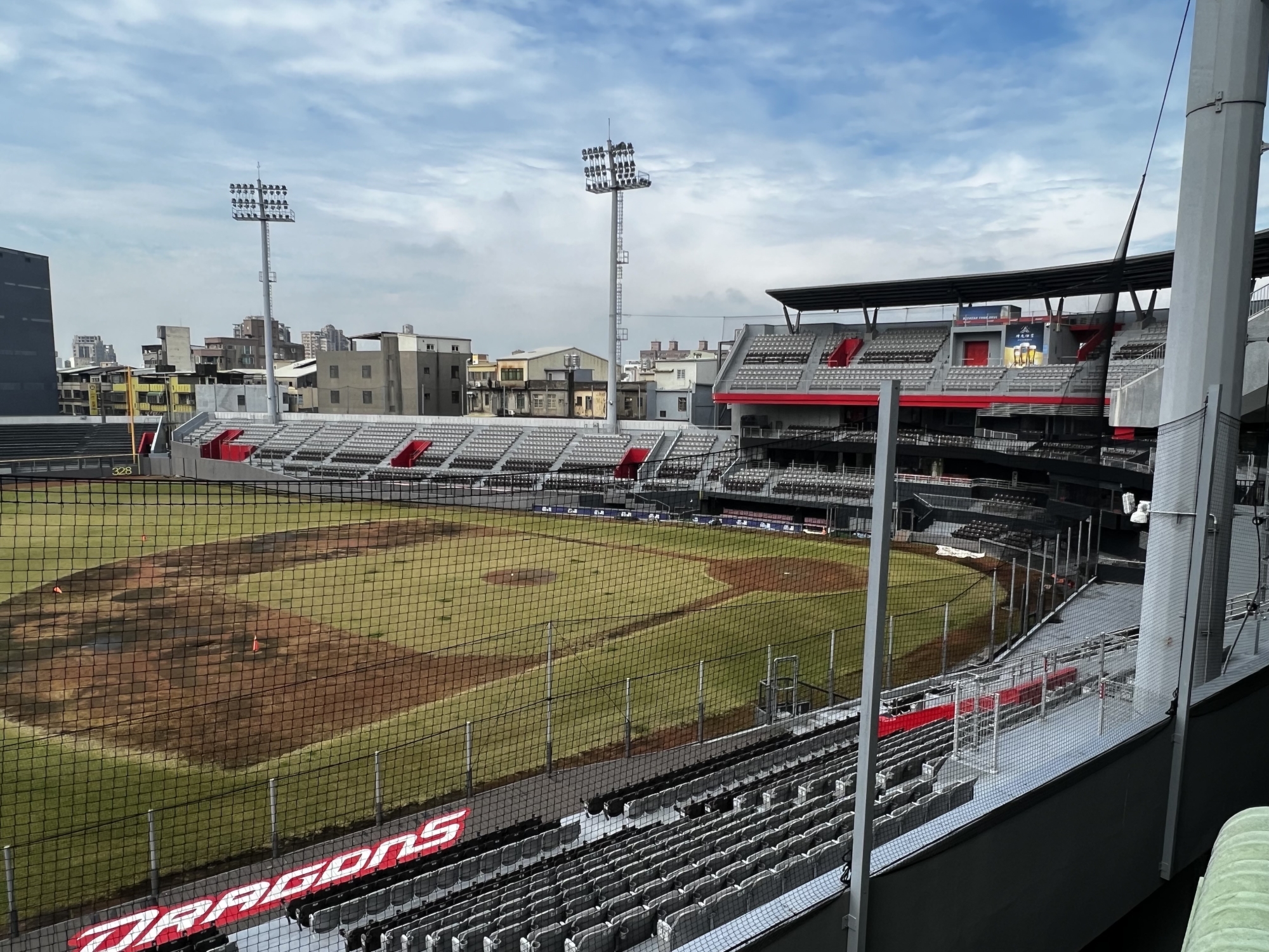 棒球場內野看台部分,目前針對廁所、球員休息室等空間進行地坪清潔、更換,同步進行外野看台舊記分板鋼構上漆、外野區排水蓋更換。