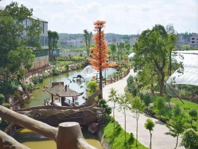 進入園區,首先映入眼簾的是龍湖音樂噴泉,湖中心有一個黃色的龍頭在噴水。進入景觀長廊,就能看到農旅園的核心水果採摘基地。園裡種植的水果主要有無花果、葡萄、藍莓、楊梅、楊桃、潮州柑、草莓等12種水果,其中光是葡萄就有6個不同的品種。漢光超順農旅園是遊客旅遊觀光、休閒體驗、親子採摘、農耕文化、科普教育、戶外拓展活動為一體的田園綜合體。