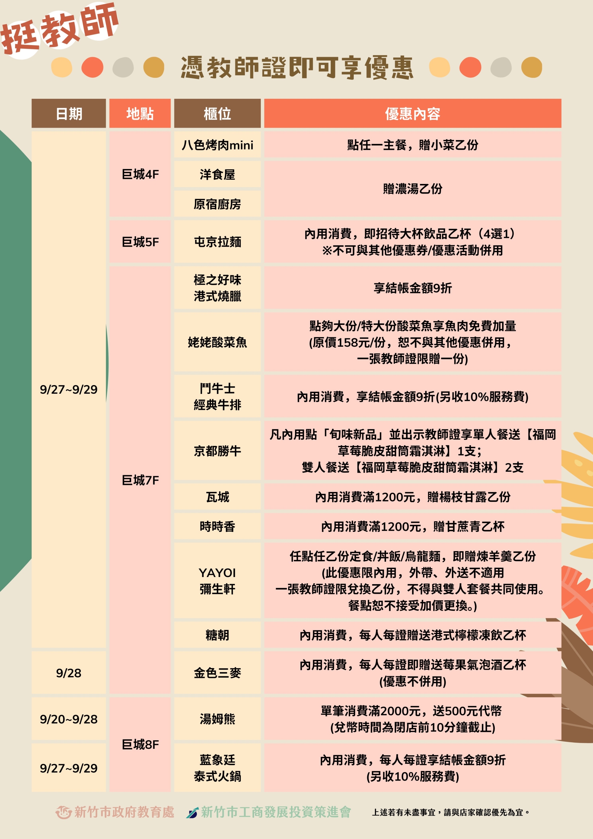 為感謝教師們無私的奉獻與耕耘,新竹市政府與遠東巨城購物中心及大魯閣湳雅廣場合作,推出「教師節優惠活動」,提供涵蓋食衣住行育樂等多面向專屬優惠,讓教師們在教務繁忙之餘,也能享有生活上的小確幸。