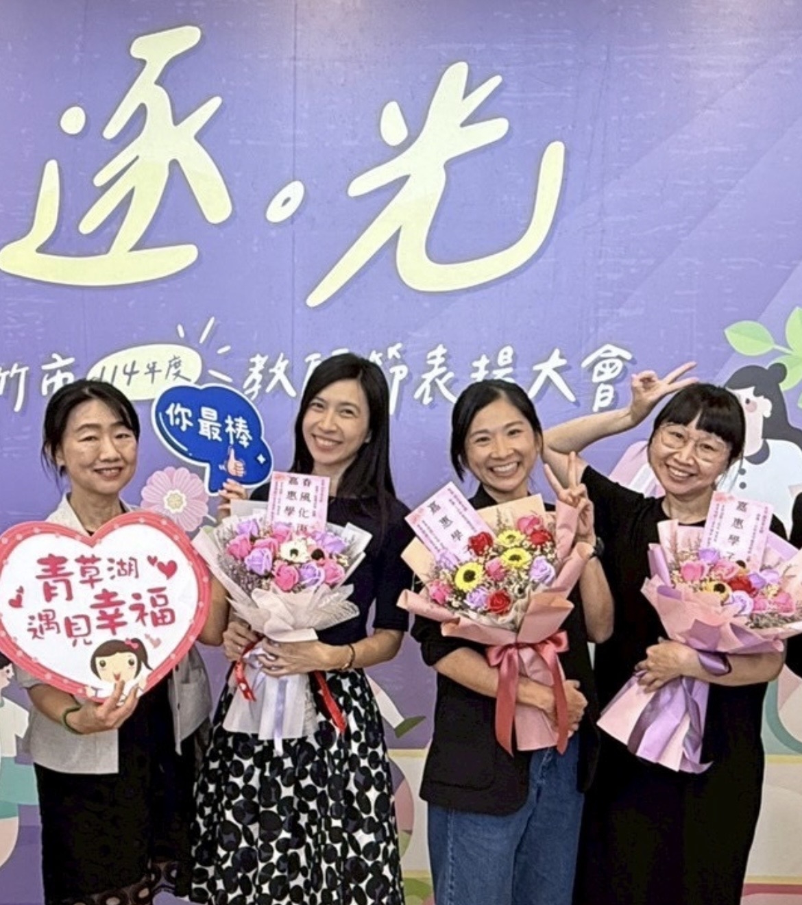 左起青小校長周雯娟和獲獎老師呂宛侖、林佳慧、蘇聖惠共享榮耀 何高祿攝