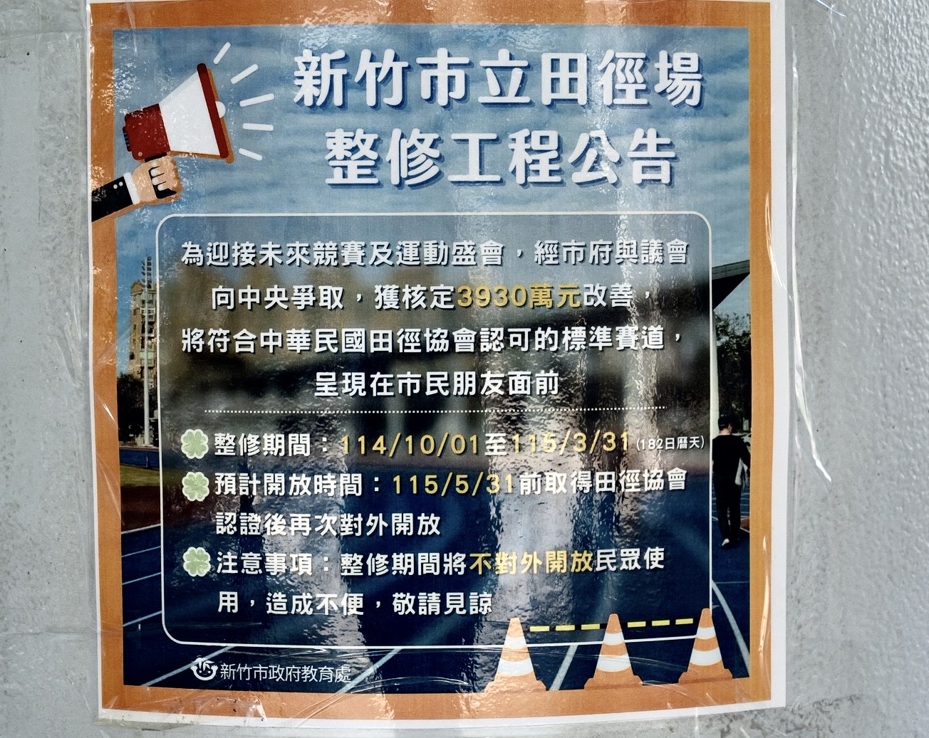 教育處說,工程期間民眾可至鄰近國中小操場運動,開放時間可至各校網站查詢。期許透過本次改善,不僅可提升比賽的安全性與公平性,確保選手成績獲得全國認可,也能使田徑場成為竹市培育田徑選手的重要基地。此次工程更感謝中央與市府共同投入經費,讓竹市運動設施持續邁向升級。
