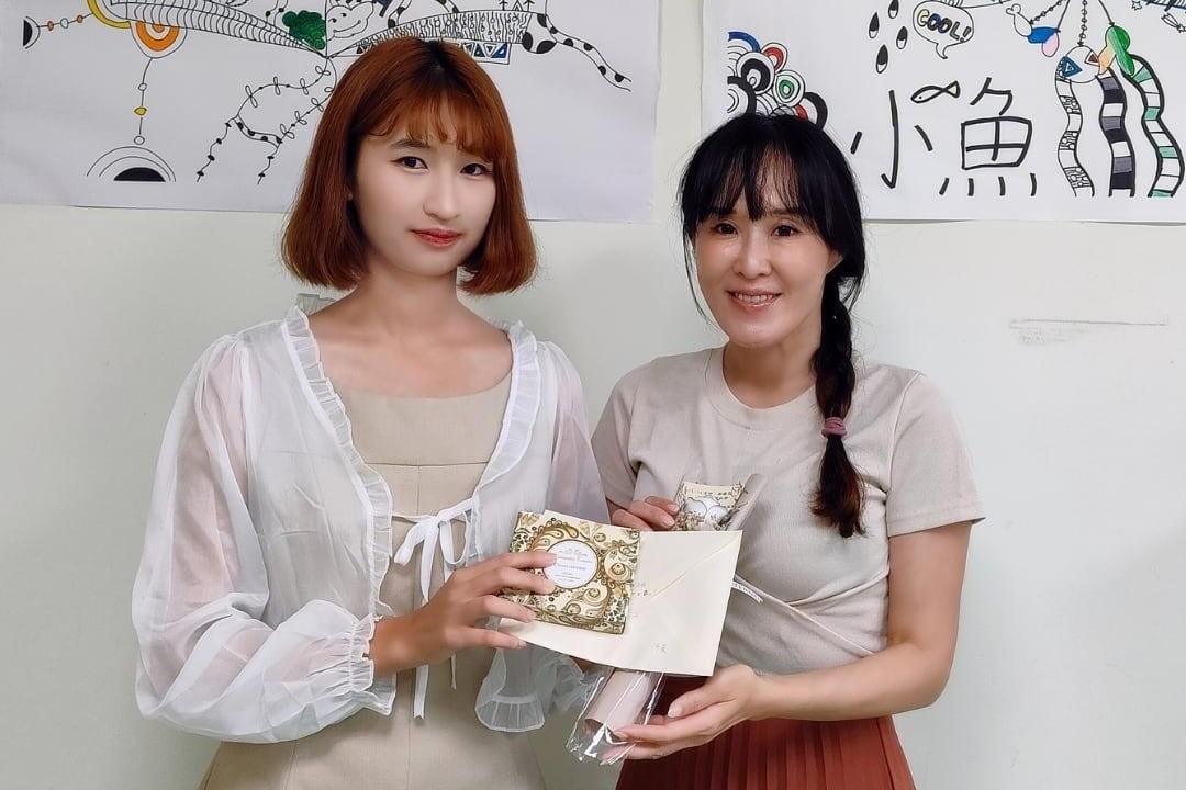 學生彭沛晨(左)敬贈老師花束與謝卡感謝指導 張祐慈攝