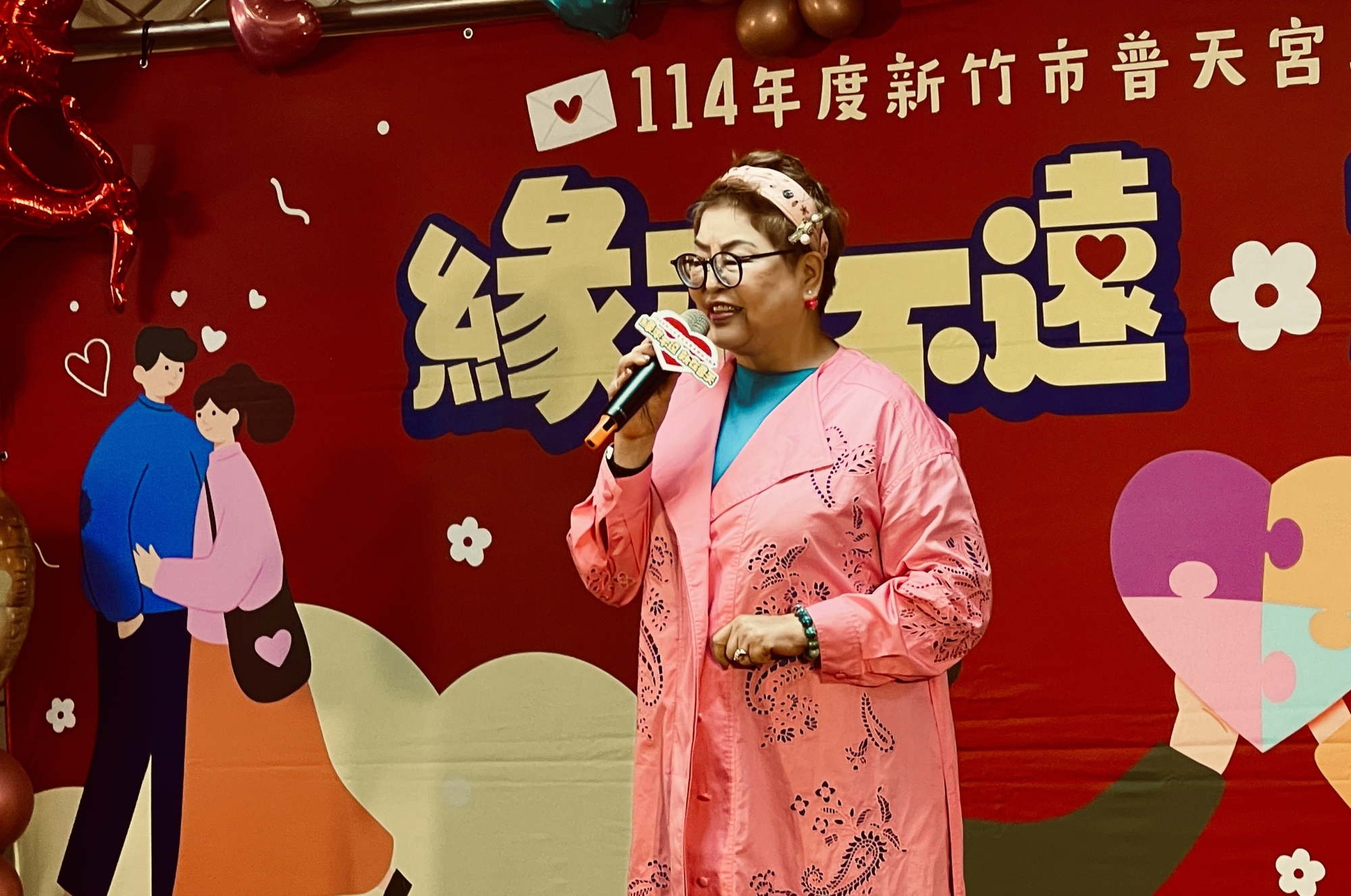 一身粉紅豔裝普天宮董事長鄭逸榛歡迎新人表示,今日「緣來不遠,就在普天」的單身聯誼活動,為普天宮向內政部申請「內政部輔導宗教團體發展及促進宗教對話補助計畫」所辦理,特別感謝內政部及竹市府一直對普天宮的支持與挹注,透過豐富有趣的系列活動,讓所有的參加者都能有機會找到有緣攜手的伴侶,進而提升台灣結婚率及生育率。