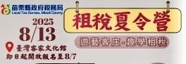 苗栗縣稅務局於8月13日(星期三),在苗栗縣銅鑼鄉臺灣客家文化館舉辦「游藝客庄-趣學租稅」活動,所剩名額不多,報名期限截至8月7日,歡迎有興趣的鄉親把握機會!