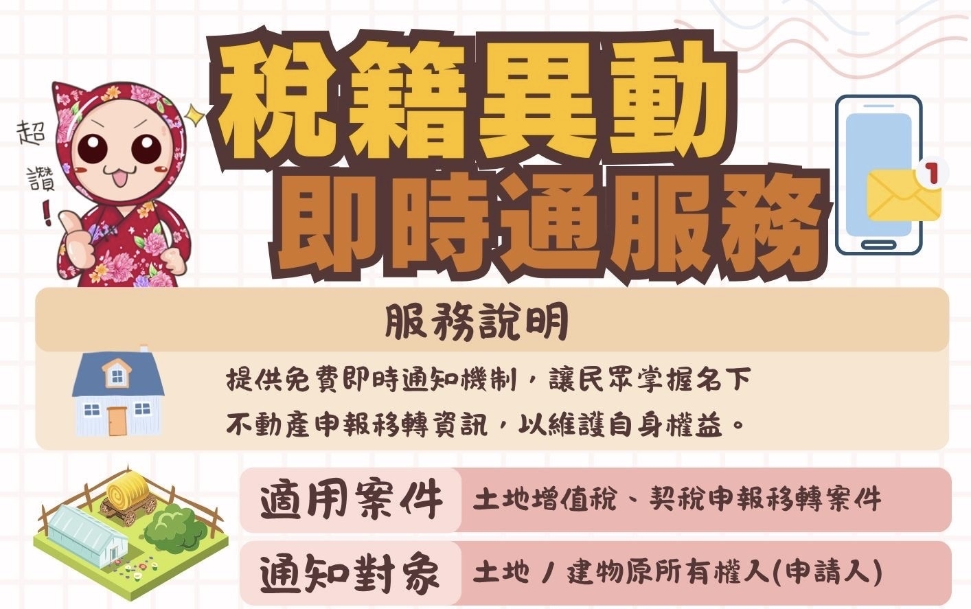 為強化不動產交易安全、預防詐騙案件發生,財政部自114年7月1日起正式推出「稅籍異動即時通」服務。經申請並完成信箱驗證,日後當不動產所有權人名下的房屋或土地發生契稅或土地增值稅申報時,系統將即時發送電子郵件、手機簡訊或LINE推播通知,讓您即時掌握名下不動產異動情形,協助把關財產安全。