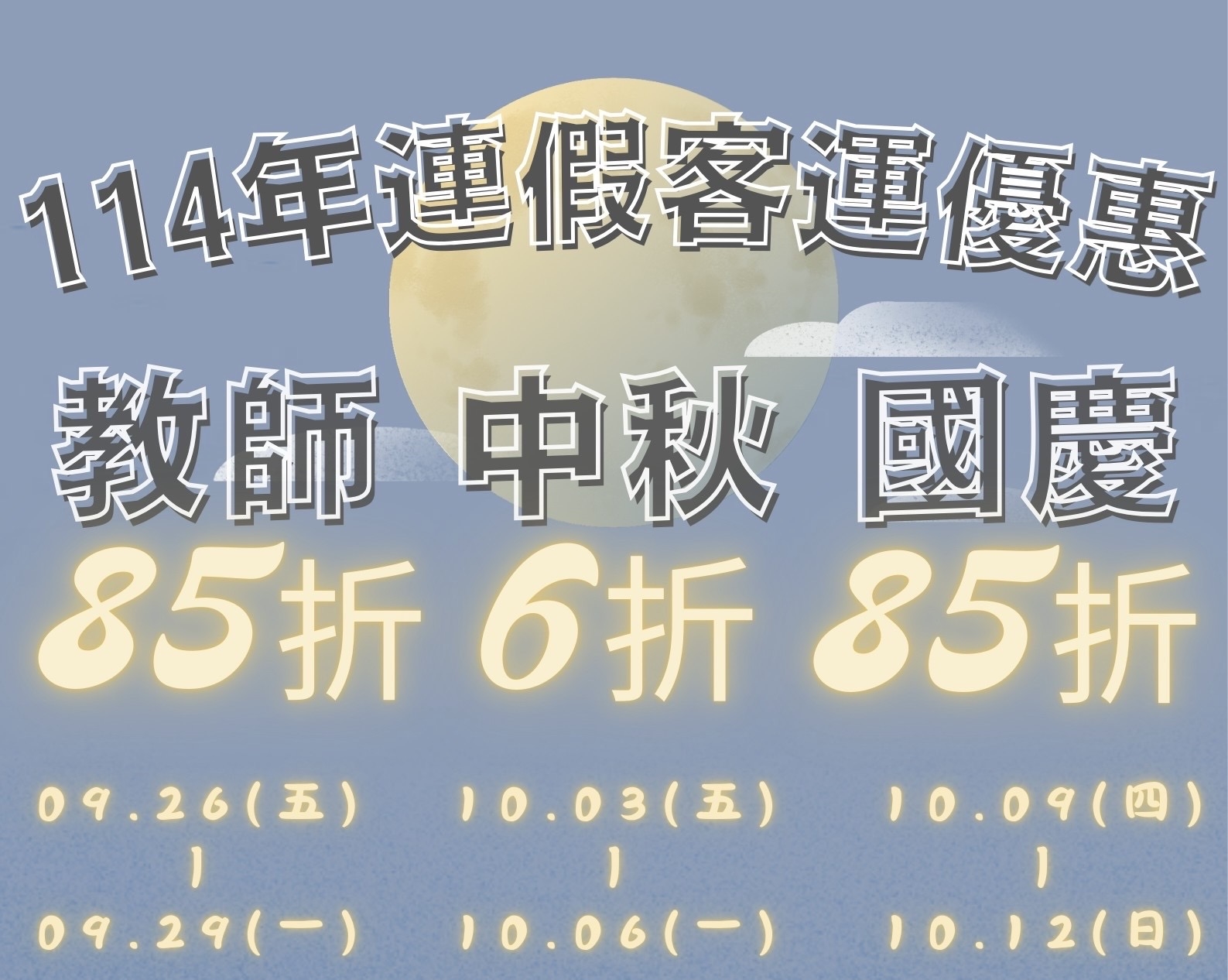 教師節自26日起(連假前1日)至29日止,搭乘指定84條國道客運路線可享平日優惠票價或票價85折優惠;中秋節10月3日起(連假前1日)至10月6日止,搭乘指定84條國道客運路線可享平日優惠票價或票價6折優惠。