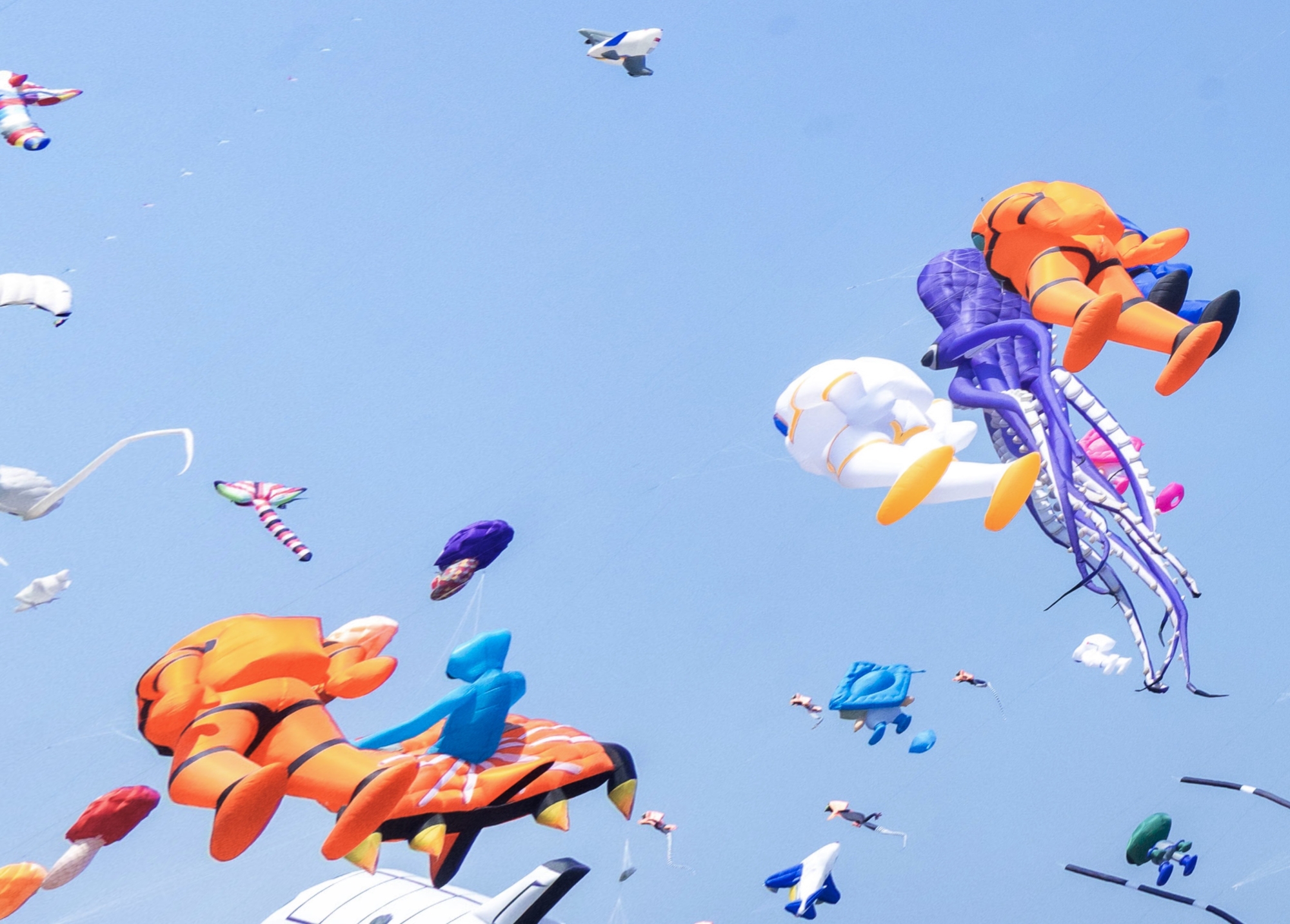紐西蘭團隊以大型太空人陣列與「星際賽車」風箏震撼登場,宛如太空艦隊降臨港灣;新加坡團隊則以魚尾獅群風箏增添文化交流色彩,為國際盛典注入新亮點。