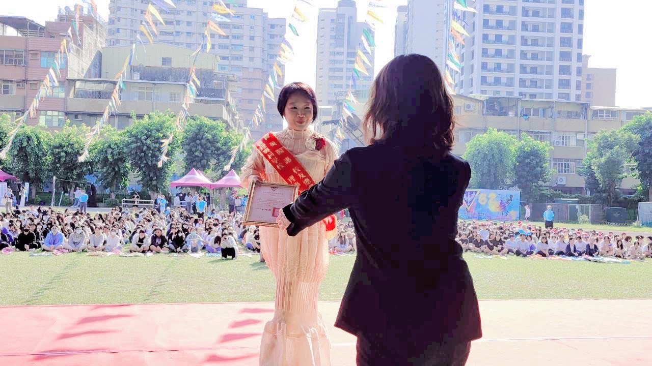 育英醫護管理專科學校於今日舉辦創校 62 週年校慶典禮,現場陽光普照、氣氛熱烈。在司令台中央就座的知名藝術家、育英校友施雪紅,見證母校校慶盛況,難掩感動與喜悅。