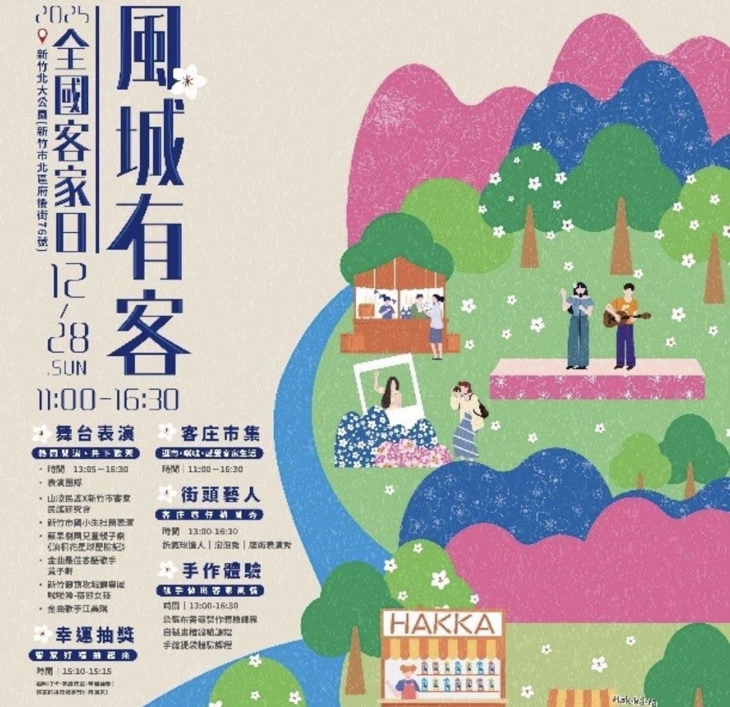 為推廣客家文化並深化市民參與,新竹市政府將於12月28日在新竹市北大公園舉辦「2025風城有客˙全國客家日」客家藝文活動,透過舞台演出、風格市集及DIY手作體驗等多元內容,打造適合各年齡層參與的戶外藝文盛會,邀請市民朋友一同感受風城客庄的文化風采。