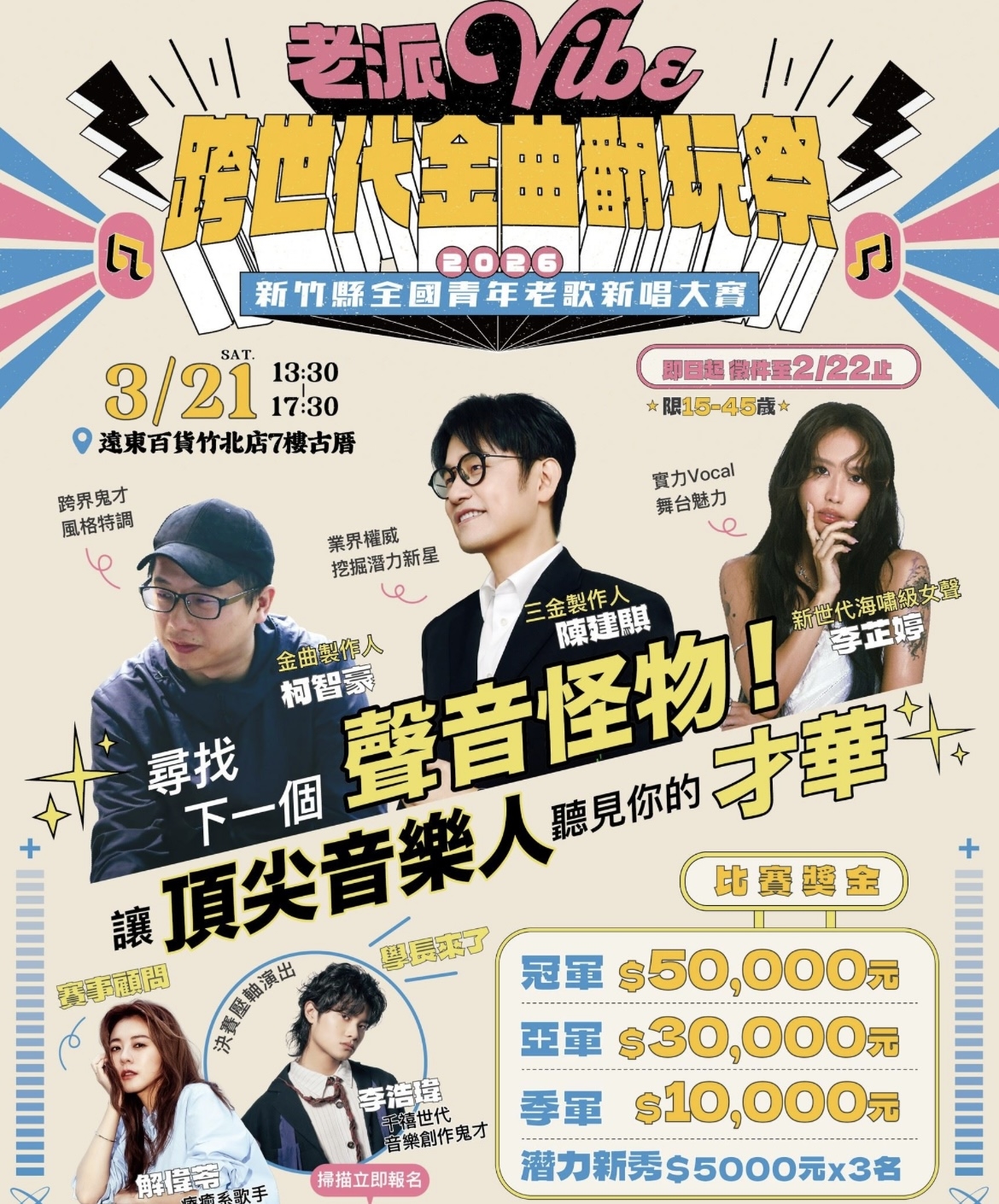 想要才華變現、讓神級製作人聽見你的聲音嗎?新竹縣政府教育局宣布,最強音樂賽事「老派Vibe-跨世代金曲翻玩祭」即日起正式開放報名!作為「115年青年節」系列活動的重頭戲,本次大賽祭出總獎金高達新臺幣10萬元,號召全國青年發揮創意,將1970至2000年間的經典流行樂曲重新編曲演繹。決賽將於3月21日(六)在遠東百貨竹北店盛大登場,新竹縣長楊文科廣邀青年參與,他指出,這不僅是一場比賽,更是站上C位、用音樂炸裂舞台的絕佳機會!