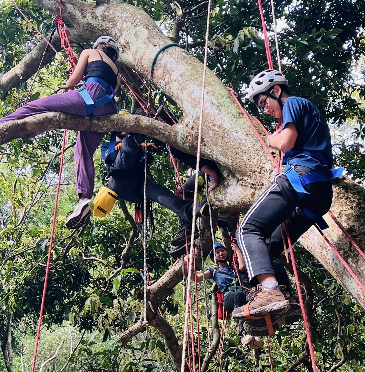 由授課教官講解樹木固定點選擇與安全檢查要領,包含主幹粗細、根系穩定及裂痕、腐朽等危險徵象辨識。並說明固定點架設與回收流程、豆袋拋擲技巧、護繩管安裝及系統架設所需繩結應用。後續由同仁進行實作,依所學完成上方固定點架設,並操作樹攀上登與下降;教官全程在旁指導協助,確保操作安全。