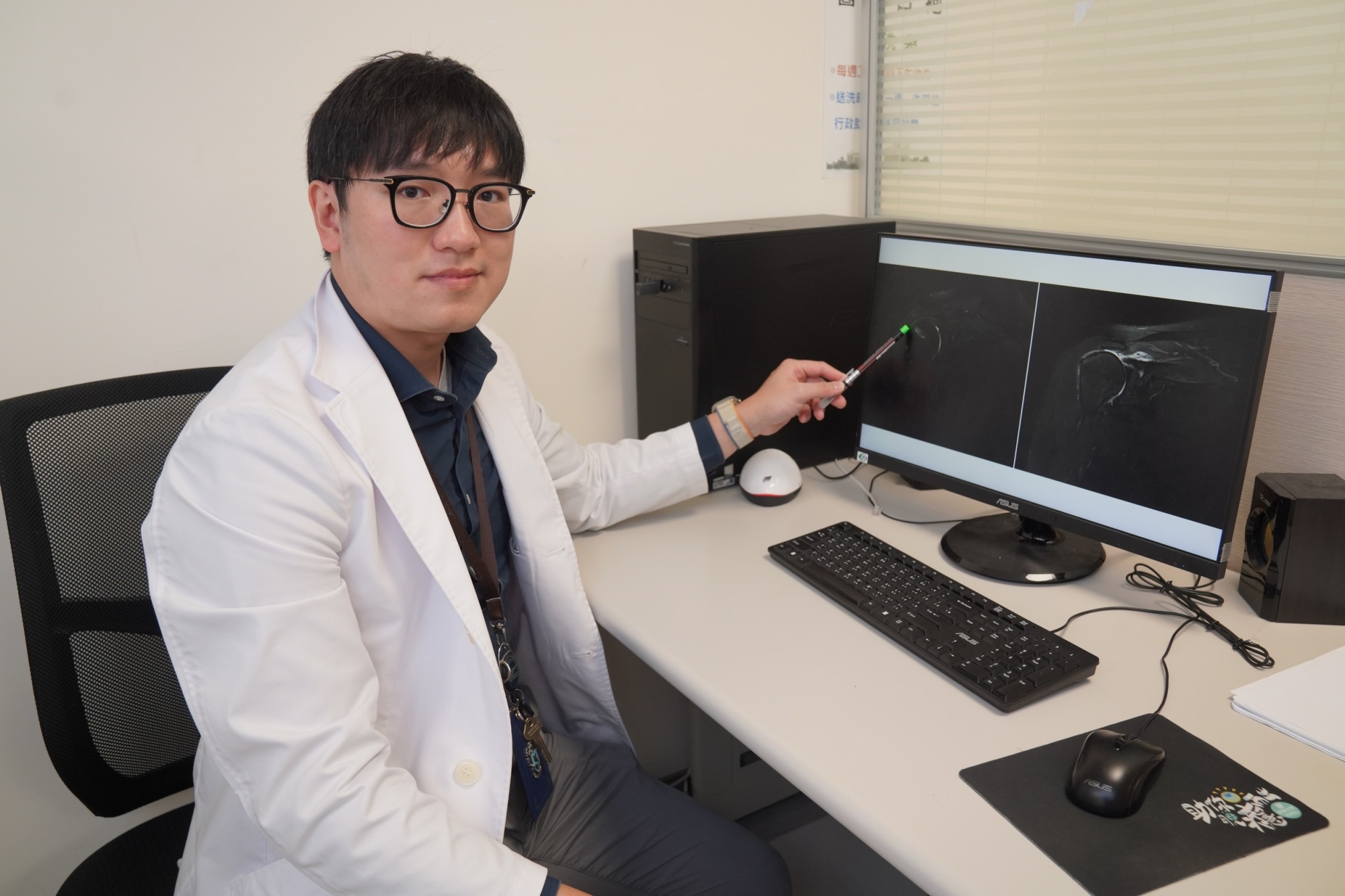 60 歲女教師肩膀痛達三個月,穿衣、提包、寫黑板都變得困難,夜間更痛到無法睡覺,求診中國醫藥大學新竹附設醫院骨科醫師葉詩翰,經理學檢查,旋轉肌夾擠測試陽性,阻力測試顯示明顯無力,經核磁共振確診「巨大旋轉肌袖撕裂」,老師肌腱薄、撕裂後明顯退縮,並已有部分脂肪浸潤,經醫病溝通,以微創關節鏡旋轉肌袖修補,結合「自體肱二頭肌轉位術」增強修復,改善患者長期肩痛、抬舉無力等困擾,並大幅降低再撕裂風險。手術歷時約2小時,住院3天,術後老師已順利恢復教學,抬手寫黑板不再疼痛無力,並向身邊親友推薦就醫。