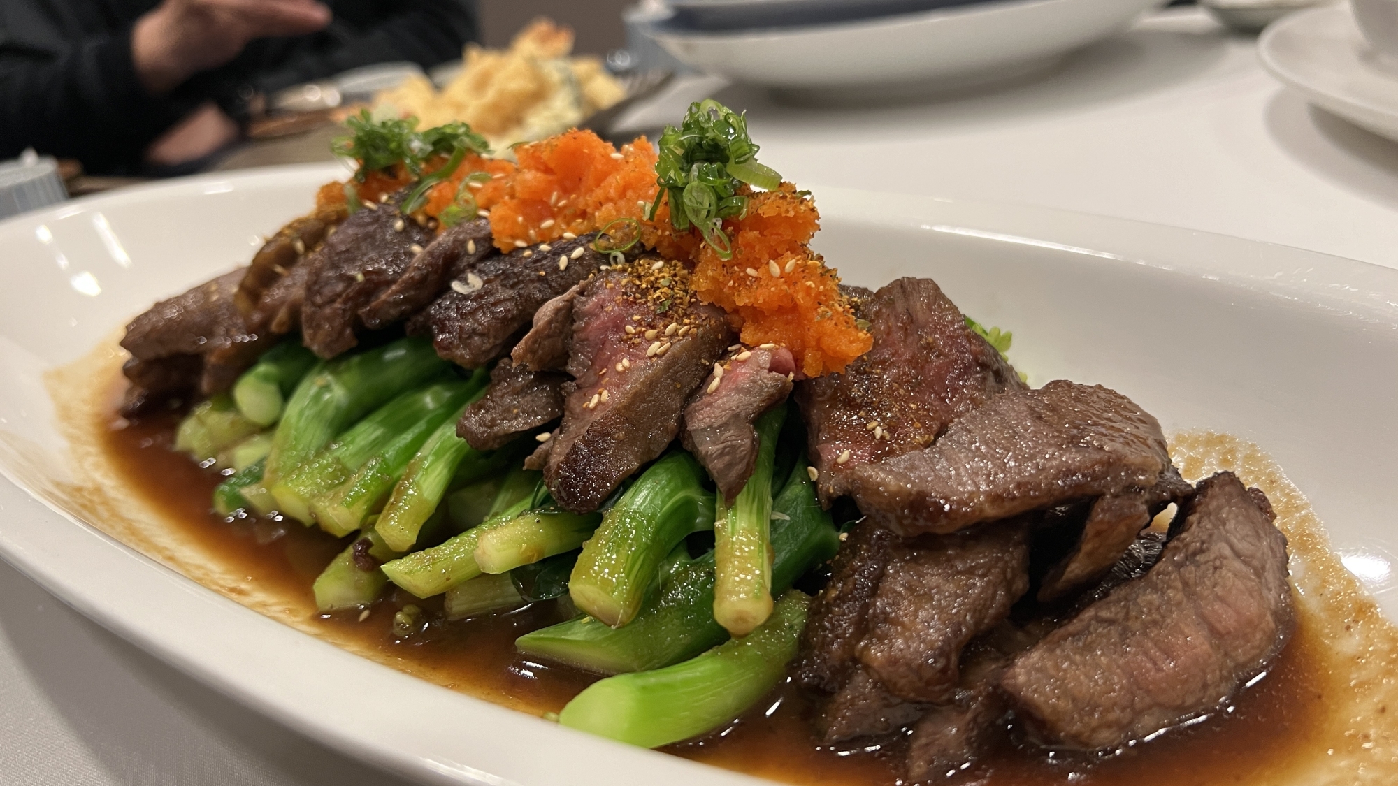 主菜陣容同樣精彩,包含以蒸煮手法呈現的古法季節鮮魚,完整保留魚肉細嫩原味;秘製香烤豬肋排香氣四溢、層次豐富;以及牛肉諸味燒,佐以日式味噌醬汁提味,肉質鮮嫩、風味濃郁,滿足宴席賓客對主菜的期待。