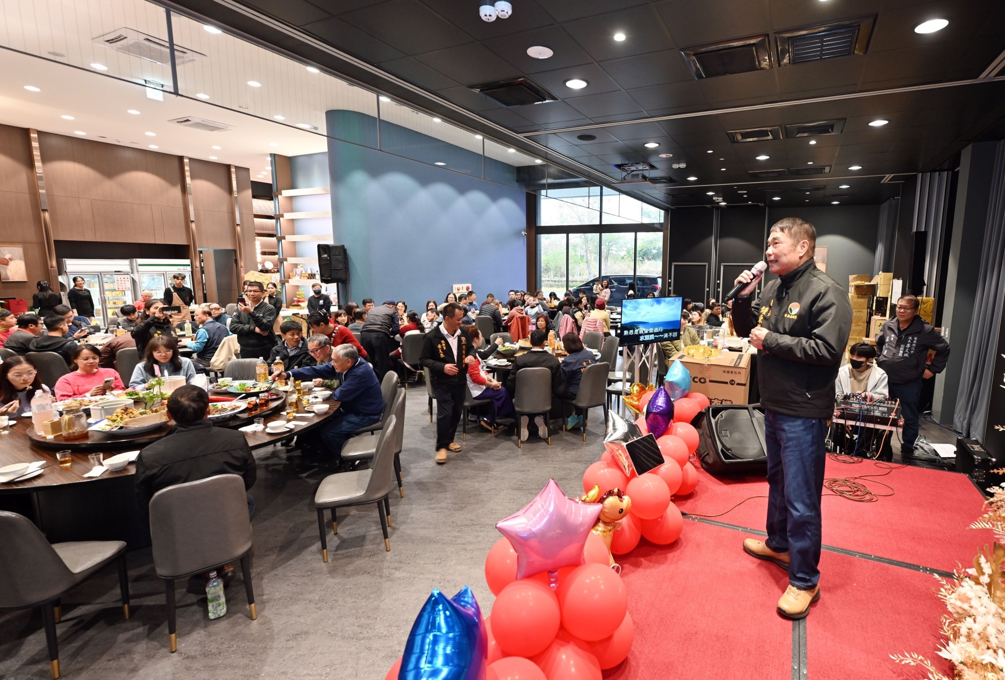 後龍鎮農會今天一日在范頭家新港宴會廳舉辦年終尾牙聯誼餐敘,縣長鍾東錦到場感謝農友和農政人員的辛勞,除現場提供一台洗衣機摸彩品,並獻唱一首台語歌「挽仙桃」與大家同樂。
