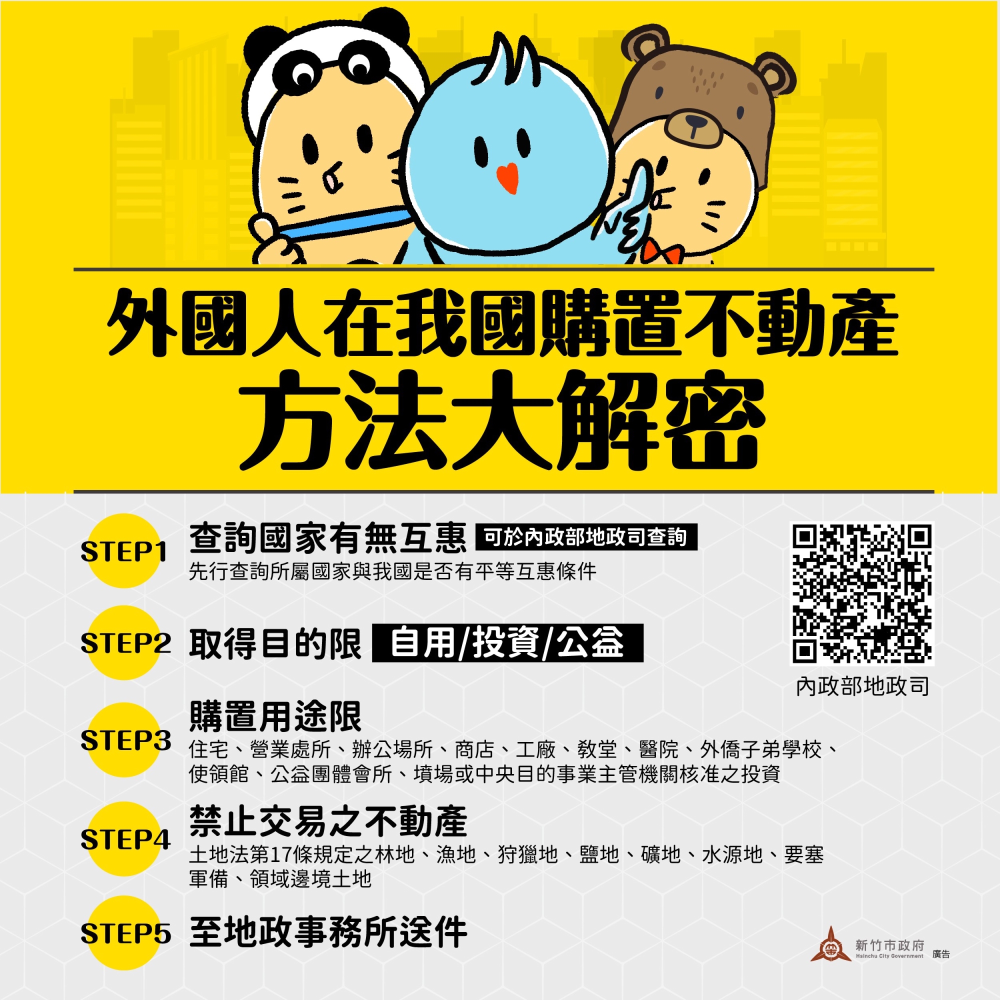竹市113年外國人士取得不動產為139筆棟,114年至10月止為135筆棟,呈現持平,研判與不動產交易市場政策(第7波信用管制措施)及全球性關稅影響下,案件數量呈現放緩趨勢有關,整體而言,外國人持有比重占全市房地交易市場比例仍屬穩定。