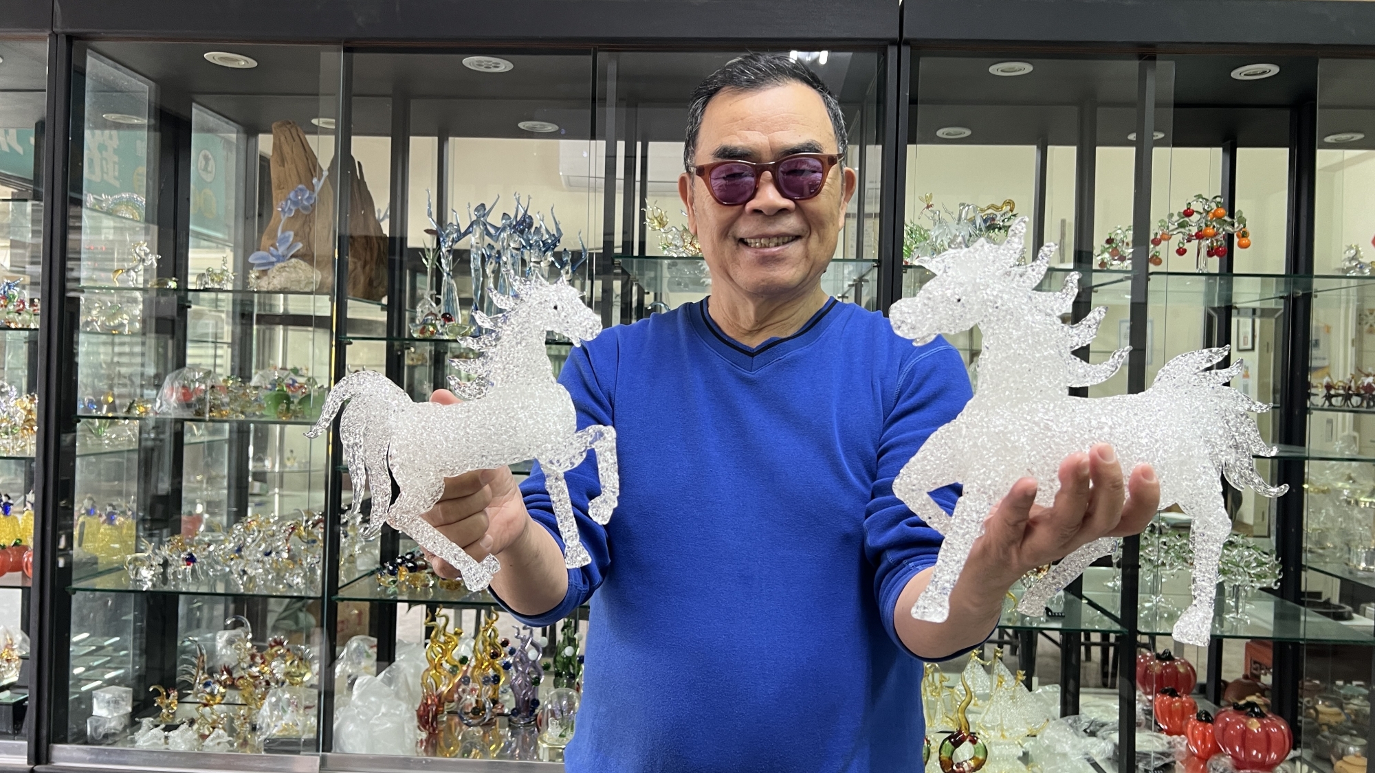 約莫20年前榮獲台灣工藝之家工藝師許源榮,在華人世界玻璃藝術競賽,創意飛馬贏得金牌獎,促使臘月間竹市華江街83號許源榮琉璃藝坊,生意興隆萬馬奔騰,忙得難以分身。
