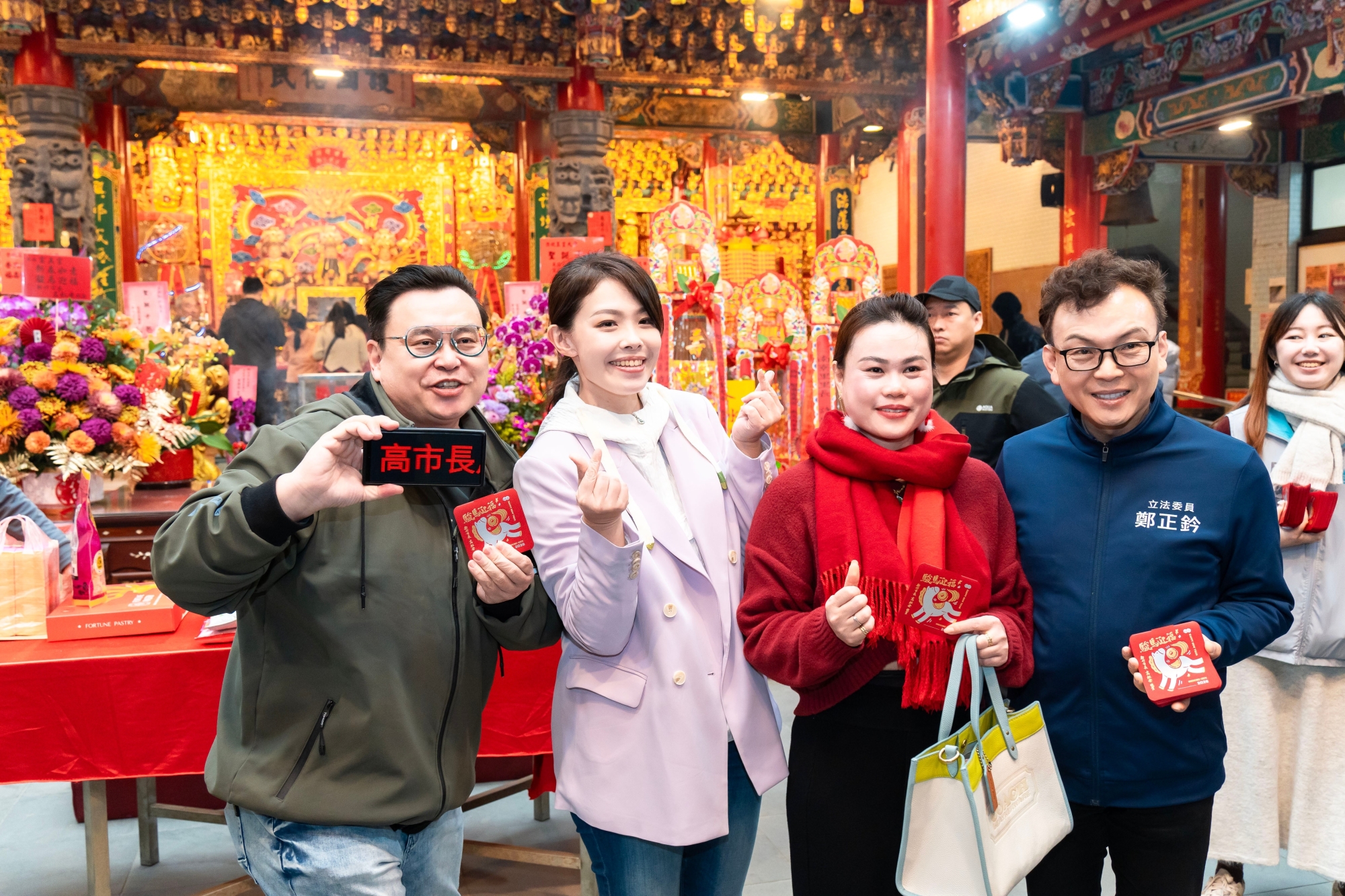 迎春納福、喜氣洋洋!今(17)日大年初一,新竹市長高虹安前往新竹天后宮、關帝廟、普天宮、埔頂慈雲庵、開臺金山寺、富美宮、代天府、太初玄清宮、香山天后宮、香山財神廟以及鹿仔坑福德宮等新竹市各大廟宇上香祈福,祈願新的一年風調雨順、市運昌隆,並發放象徵祝福的「駿馬迎福」小紅包,與前來參拜的民眾共享新春喜悅,一同迎接農曆新年。