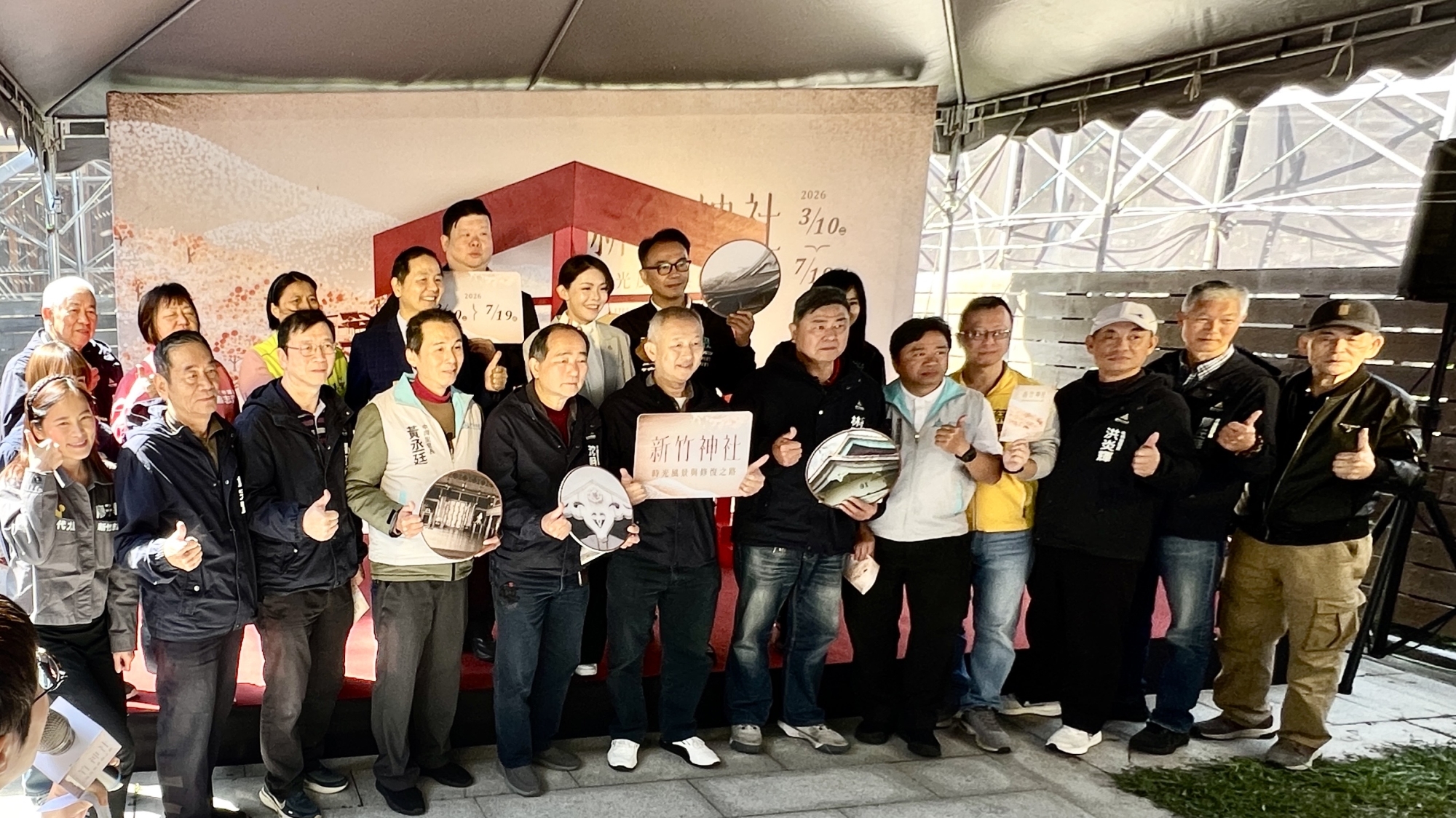 新竹市府為持續推廣古蹟保存與文化傳承,文化局今(12)日於市定古蹟新竹少年刑務所演武場舉辦115年首檔展覽「新竹神社—時光風景與修復之路」開幕記者會。市長高虹安親自出席,並將象徵祈願意涵的繪馬掛上,象徵對古蹟修復的祝福與期待,正式宣布展覽開幕。