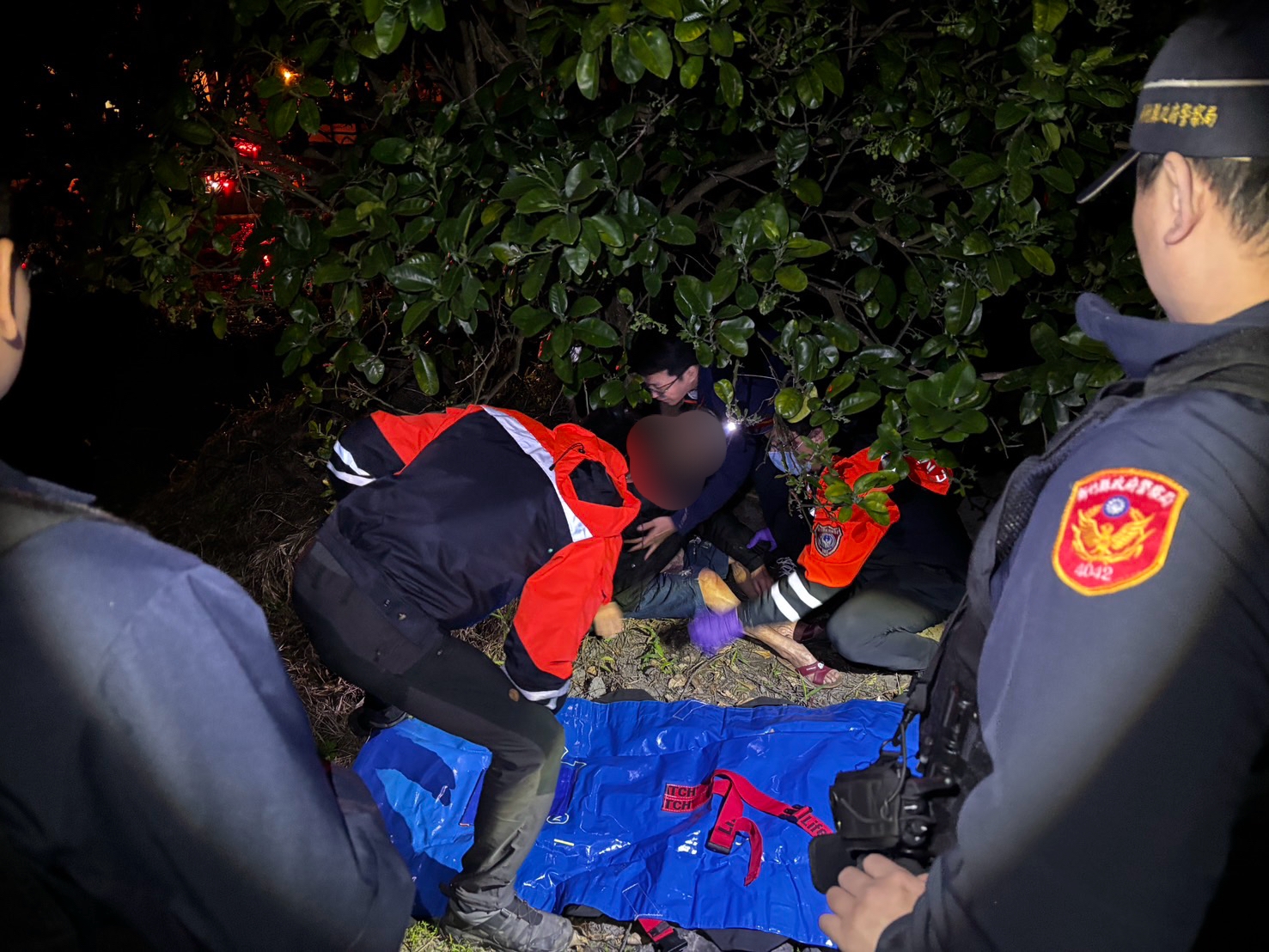 芎林所同仁立即以家屬住家往外,沿路調閱監視器,發現失蹤長者於當日上午即步行離家,惟行走方向為田地等產業道路,且無返回情形。考量當時已22時許,夜間寒冷,失蹤長者外出許久恐難以支撐,經該所同仁研判該長者可能於田地間,發動同仁持手電筒摸黑搜尋,於田地內距道路約100公尺樹下發現該失蹤長者倒臥地上,幸仍意識清醒,惟無法回應員警問話,經請報案人現場指認確定為其失蹤母親,經緊急通報119就醫後已無大礙,家屬對警方積極協助,避免不幸憾事發生,表達萬分感謝。