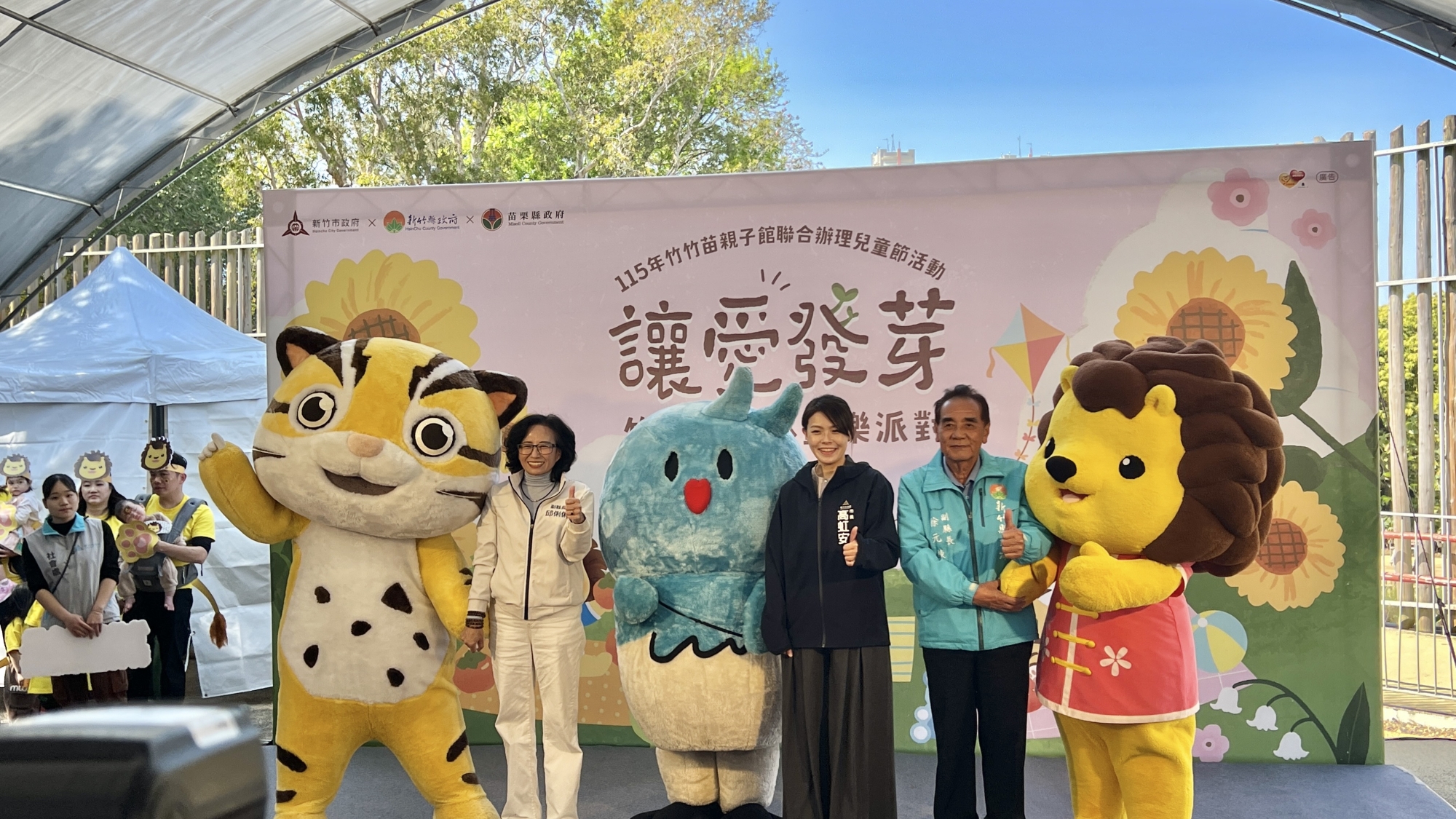 新竹市、新竹縣及苗栗縣首度攜手合作舉辦「竹竹苗森林童樂派對:讓愛發芽」活動,今(14)日在新竹市立動物園熱鬧登場。新竹市長高虹安、新竹縣副縣長徐元棟、苗栗縣副縣長邱俐俐聯合出席,並與三縣市超人氣吉祥物皮卡、皮皮獅及貓裏喵一同啟動象徵「竹竹苗幸福育兒金黃地圖」,象徵串聯竹竹苗區域親子館資源的「溫暖光譜」,展現三縣市跨域合作整合育兒資源的成果,也為區域親子服務合作開啟新的里程碑。