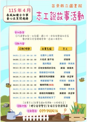 意盎然的四月,微風輕拂、萬物欣欣向榮。苗栗縣立圖書館在這充滿生機的季節裡,邀請親子一同走進溫暖的閱讀天地,在故事與想像交織的時光中,共享閱讀帶來的歡樂與感動。透過志工們生動的說故事活動,讓孩子在書頁之間展開想像的翅膀,體會故事的趣味與閱讀的美好。