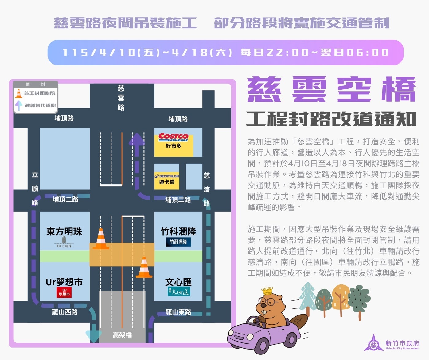 施工期間,因大型吊裝機具進場及安全防護需求,慈雲路部分路段將於夜間實施全面封閉管制。市府提醒用路人提前規劃行程並配合改道:北向(往竹北)車輛請改行慈濟路,南向(往園區)車輛請改行立鵬路。現場將配置充足交維人員並加強警示設施,請民眾行經施工路段減速慢行,依指示通行,以確保行車安全。