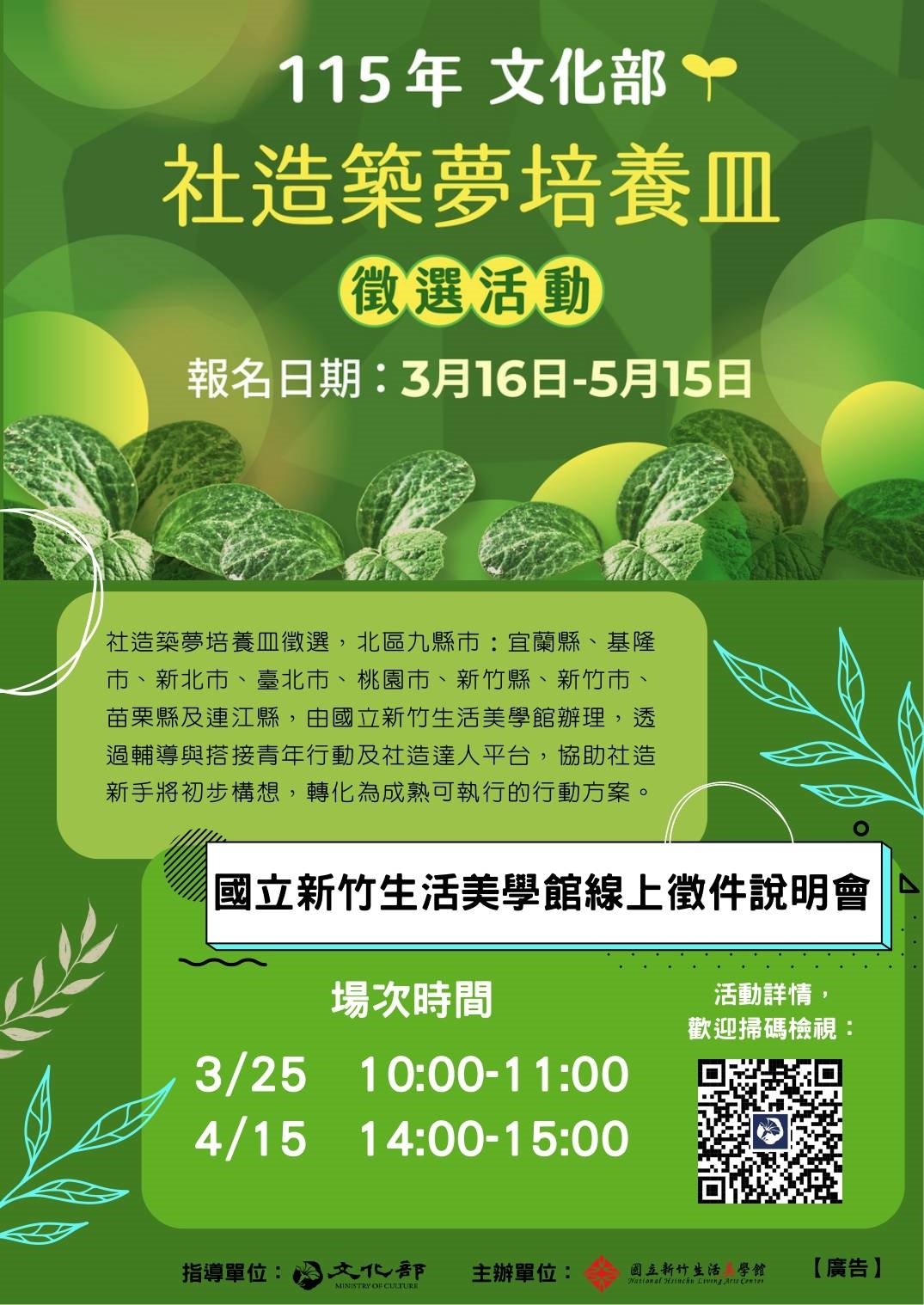 「社造築夢培養皿」計畫徵件自3月16日起至5月15日止,只要是年滿18歲之自然人,且計畫執行地點位於北區九縣市皆可向國立新竹生活美學館提案。讓專業的業師陪伴您一起將夢想轉化為具體行動。
