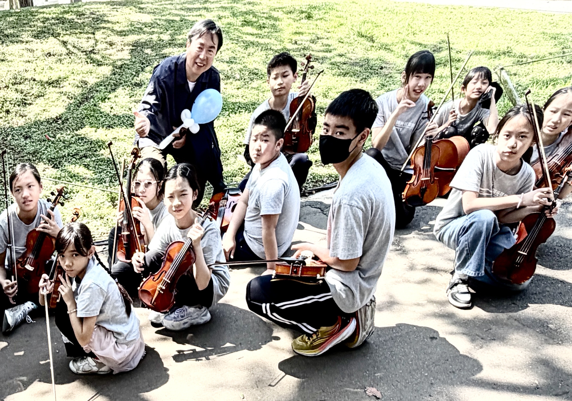 陽光國小校長蕭輝勲(後左)帶弦樂社同學為兒藝節加溫 何高祿攝