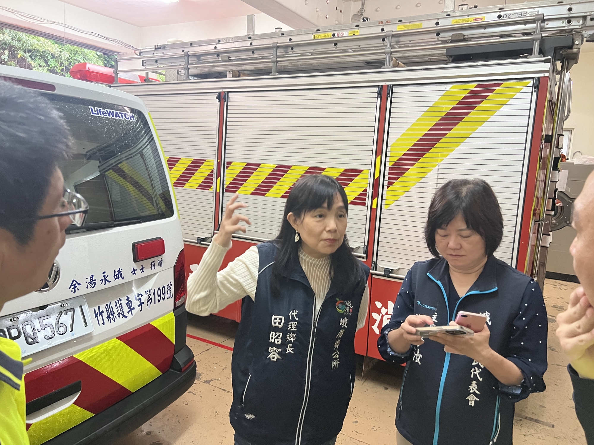田昭容(左二)、溫修汝(右二)協調一一九輕重緩急馳往救災 圖∕峨眉鄉公所