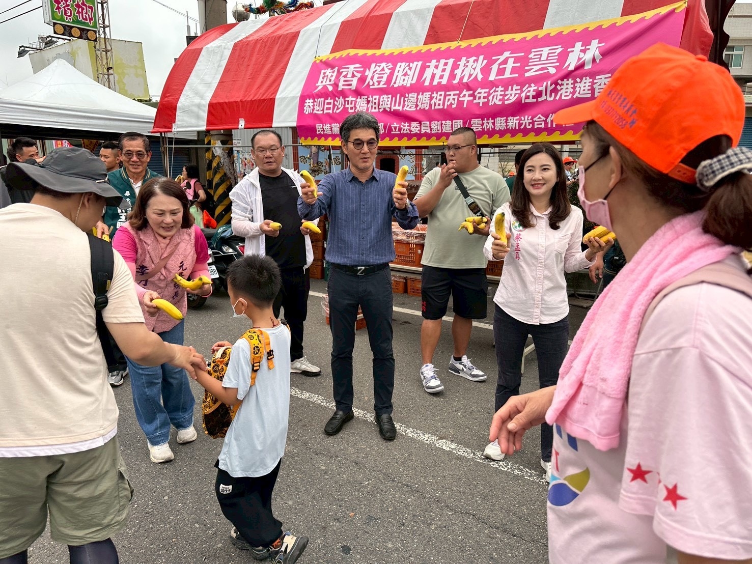 白沙屯媽祖徒步前往北港進香,台灣年度最具影響力的宗教盛事。為了遠道而來的香燈腳們,立委劉建國,今日與雲林在地合作社及蕉農攜手,於北港進香路線設置熱血應援站。現場除了發放雲林在地優質香蕉補充體力,更特別發送「民主香燈腳」飄帶,邀請信眾一同感受媽祖慈悲,並祈求國泰民安。
