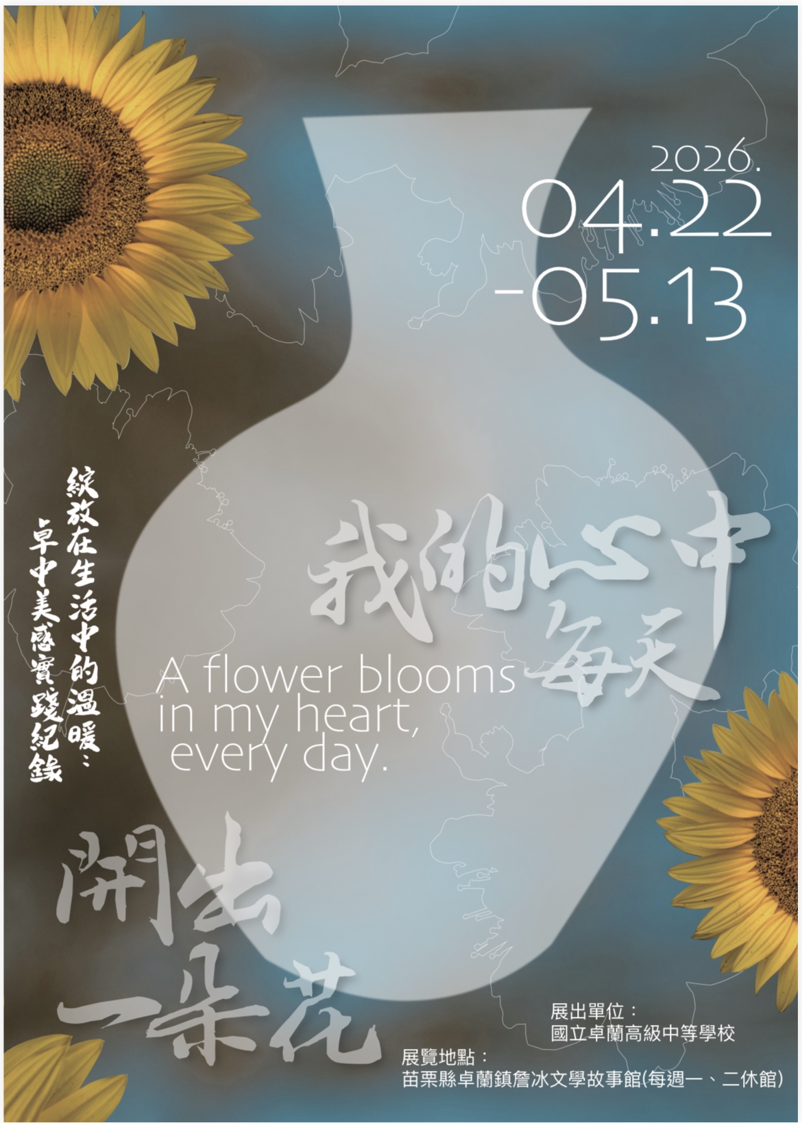我的心中每天開出一朵花美展,自22(四)到5/13(三),在卓蘭鎮詹冰文學館展覽,正是這份長年累積的動人呈現。美不再只是觀看的對象,而成為情感流動的媒介。那一聲聲溫柔的「早安」,那一份份靜靜綻放的花香,正是教育最深層的回應——讓人願意靠近彼此,願意傳遞善意。