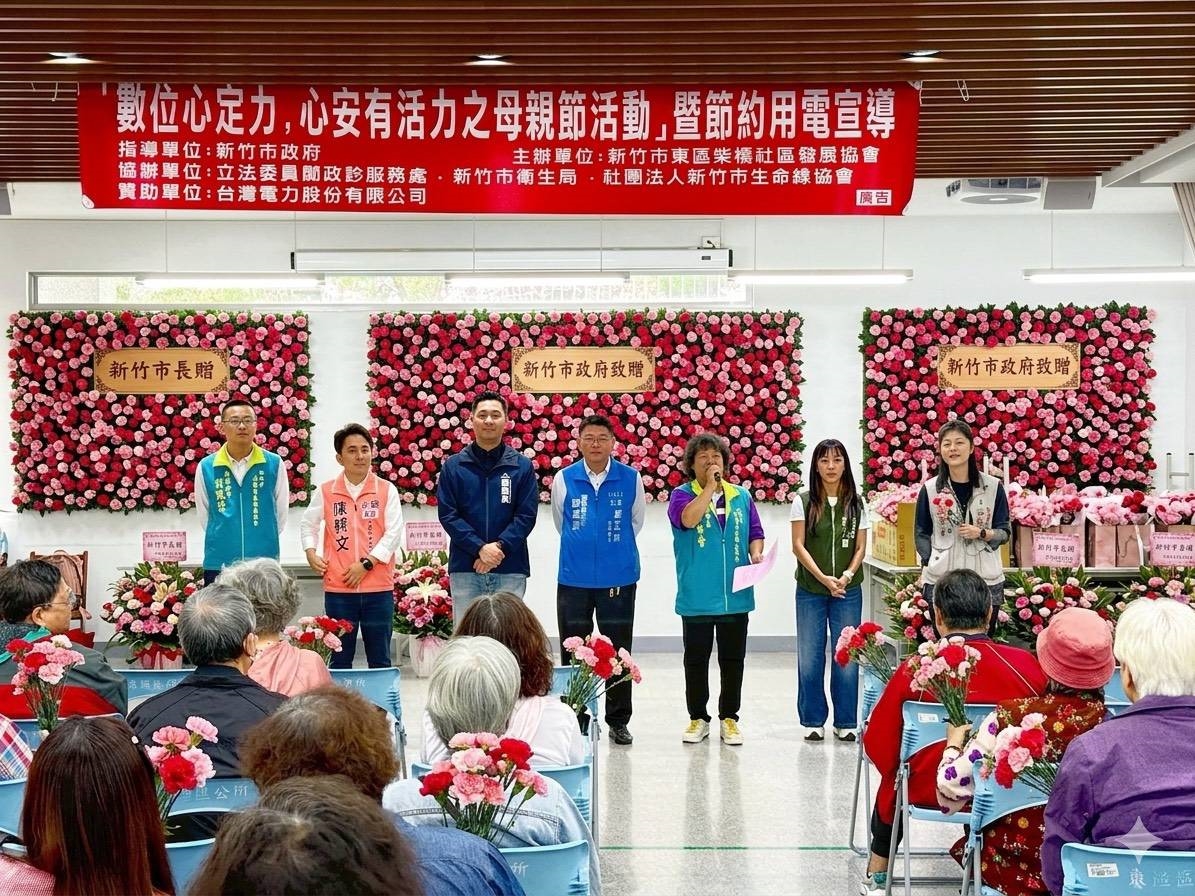 新竹市東區柴橋社區發展協會,25日在柴橋市民活動中心,熱鬧舉辦辦數位心定力,心安有活力之母親節歡聚,並且宣導節約用電,民眾出席踴躍,賀客貴賓絡繹不絕,給母親節前夕帶來高度喜氣。