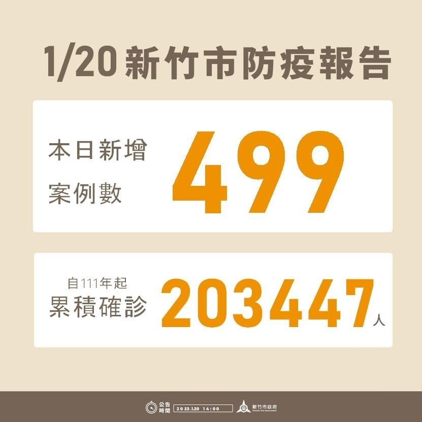 新竹市今20日新增499例確診個案,自111年起累積確診203,477人。指揮中心為確保COVID-19確診民眾於農曆春節連假期間可獲得適當醫療照護及就醫諮詢,及時取得口服抗病毒藥物,啟動「醫院春節期間開設COVID-19視訊門診及諮詢專案」,由全國急救責任醫院於1月20日至1月29日春節期間開設COVID-19視訊門診及提供就醫諮詢,維護確診民眾健康權益。