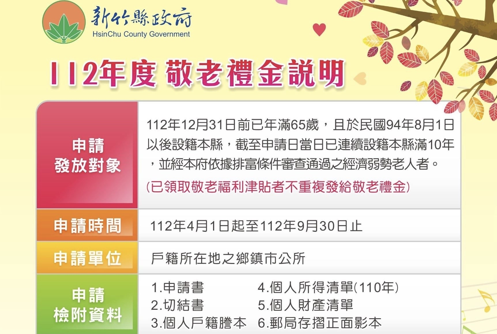 竹縣人口快速成長,縣長楊文科衡量縣府財政,在排富、不影響中央對縣府補助款前提下,決定今年續發敬老禮金一萬元,自112年4月1日起到9月3 0日受理申請。