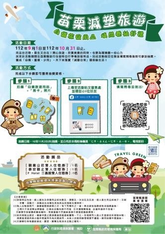 為使消費者及旅宿業者順應環保轉型,本局依據「一次用旅宿用品限制使用對象及實施方式」辦理「苗栗減塑旅遊」抽獎活動,促進民眾養成「自備、重複、少用」環保意識,並提醒旅宿業者可以調整服務模式、逐步轉型。原活動辦理日期於112年9月底截止,為增加民眾參與機會,故將活動期延長至112年10月31日。其活動辦理方式為將房卡與自備旅宿用品拍照後至環保局臉書粉絲專頁上傳照片至留言處並標註2 位朋友,填寫問卷並送出即可參與抽獎活動,本局將於112年11月2日(四)抽獎並公布於該活動貼文留言處,活動獎品為苗栗縣內環保標章旅館住宿券共3名。