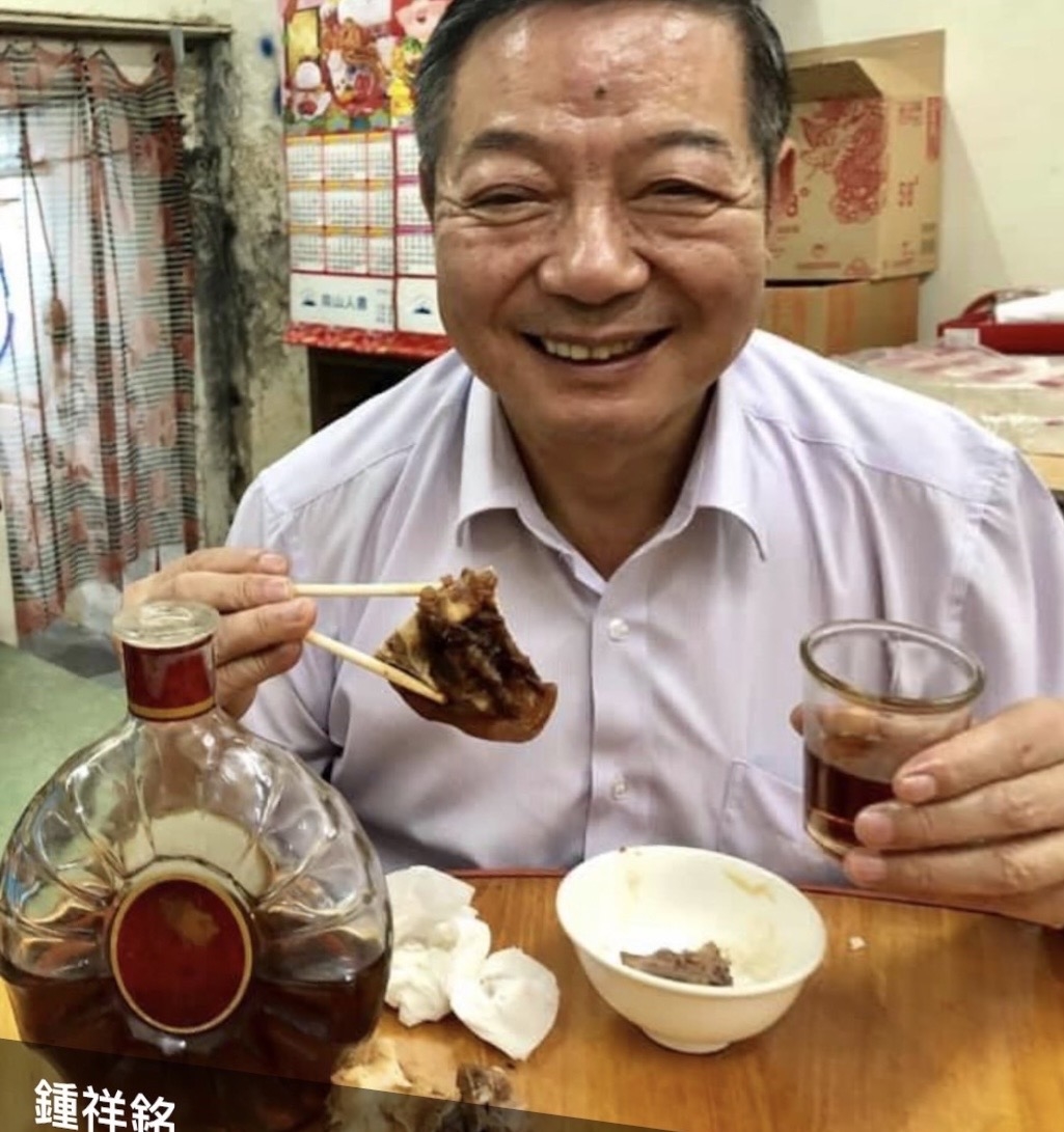 鍾祥銘一手端著四分滿酒杯,一手挾著一大塊醬汁滷肉,左前方半瓶美酒,面帶滿足笑容,大塊肉加美酒舒暢微燻神韻,而且只有一人獨享,沒有人在旁邊嘮叨,可攻、可守場景如在人間天堂。