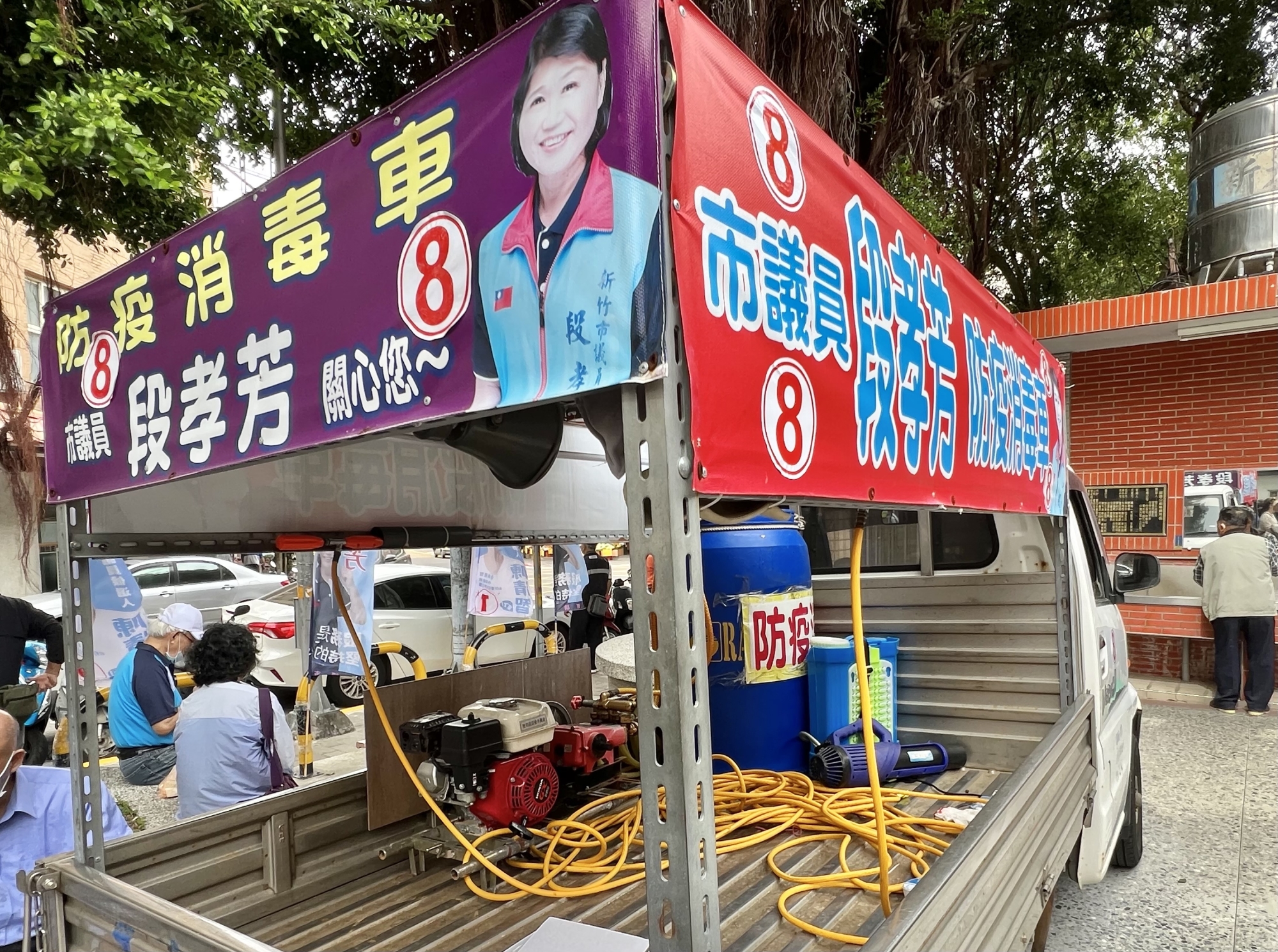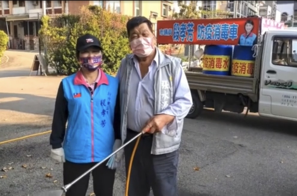 防疫消毒議員段孝芳,花了約莫一年時間,自費購買車輛與漂白水,在選區內穿梭大街小巷防疫消毒,贏得不少掌聲,也深感安慰,總算和病毒打一場助戰。