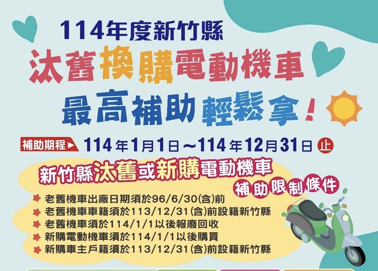 為響應國家2050淨零排放目標,加速淘汰高污染老舊機車,新竹縣自即日起正式受理「114年度機車汰舊及低污染車輛補助計畫」,最高補助金額可達新臺幣17500元,鼓勵縣民汰舊換新,一起守護清新空氣,共同打造永續健康的生活環境。