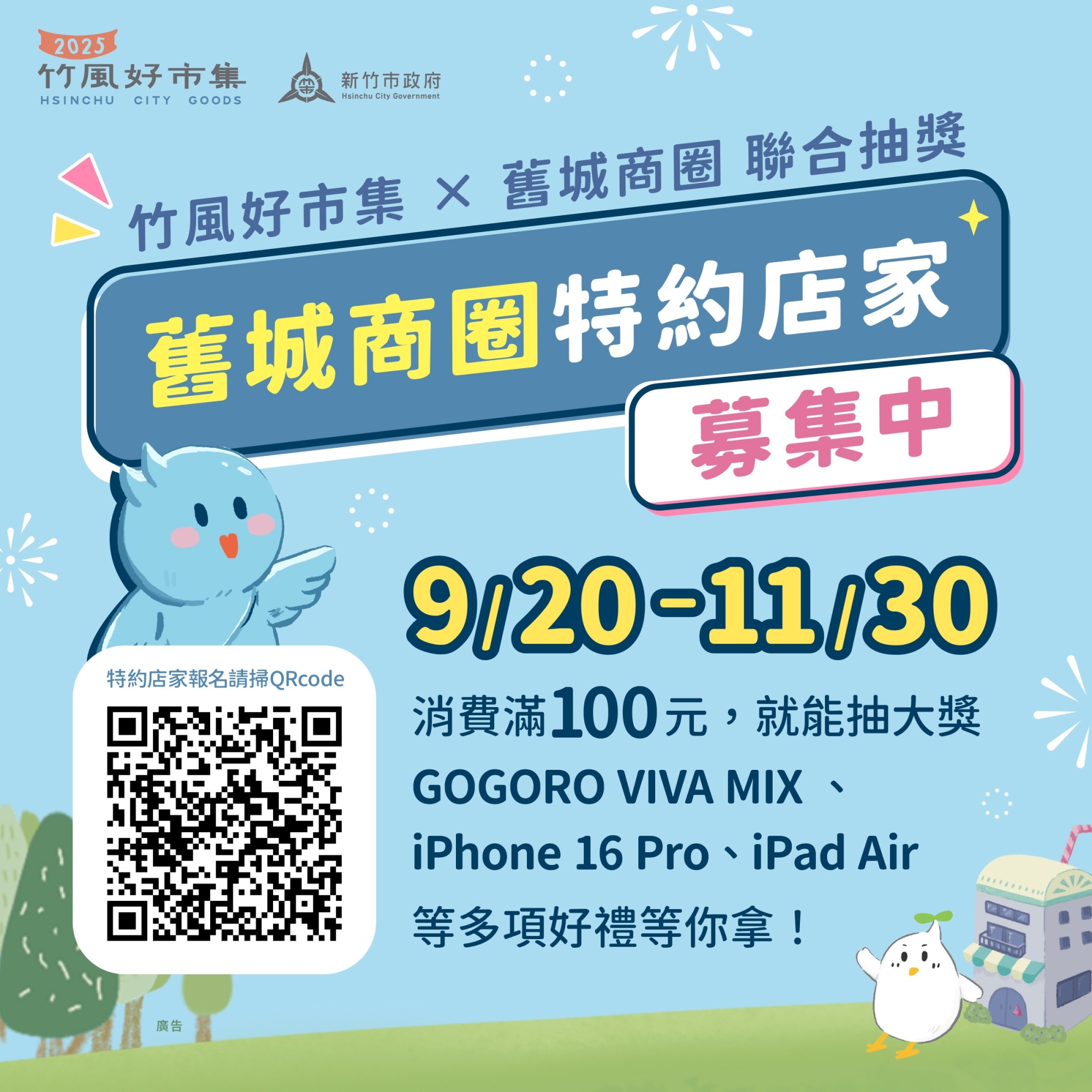 城銷處指出,20日至11月30日活動期間,民眾只要在竹風好市集或周邊特約店家單筆消費滿100元,即可獲得一次抽獎機會。最大獎為 Gogoro VIVA MIX 電動機車,還有 iPhone 16 Pro、iPad Air、Switch 2等熱門大獎,獎品總價值逾數十萬元,人人都有機會把好禮帶回家。