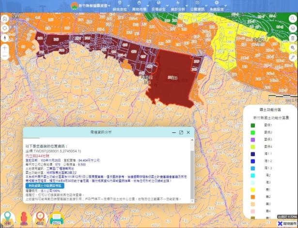 由於國土計畫影響新竹縣約40萬土地所有權人,「新竹縣智慧圖資雲」圖台網站特別設置國土功能分區圖(草案)成果查詢功能,可透過地段地號或道路門牌等資訊,查詢逐筆土地未來之功能分區,同時可搭配現行都市計畫及非都市土地使用分區及使用地一併顯示,供民眾了解自身土地相關資訊。