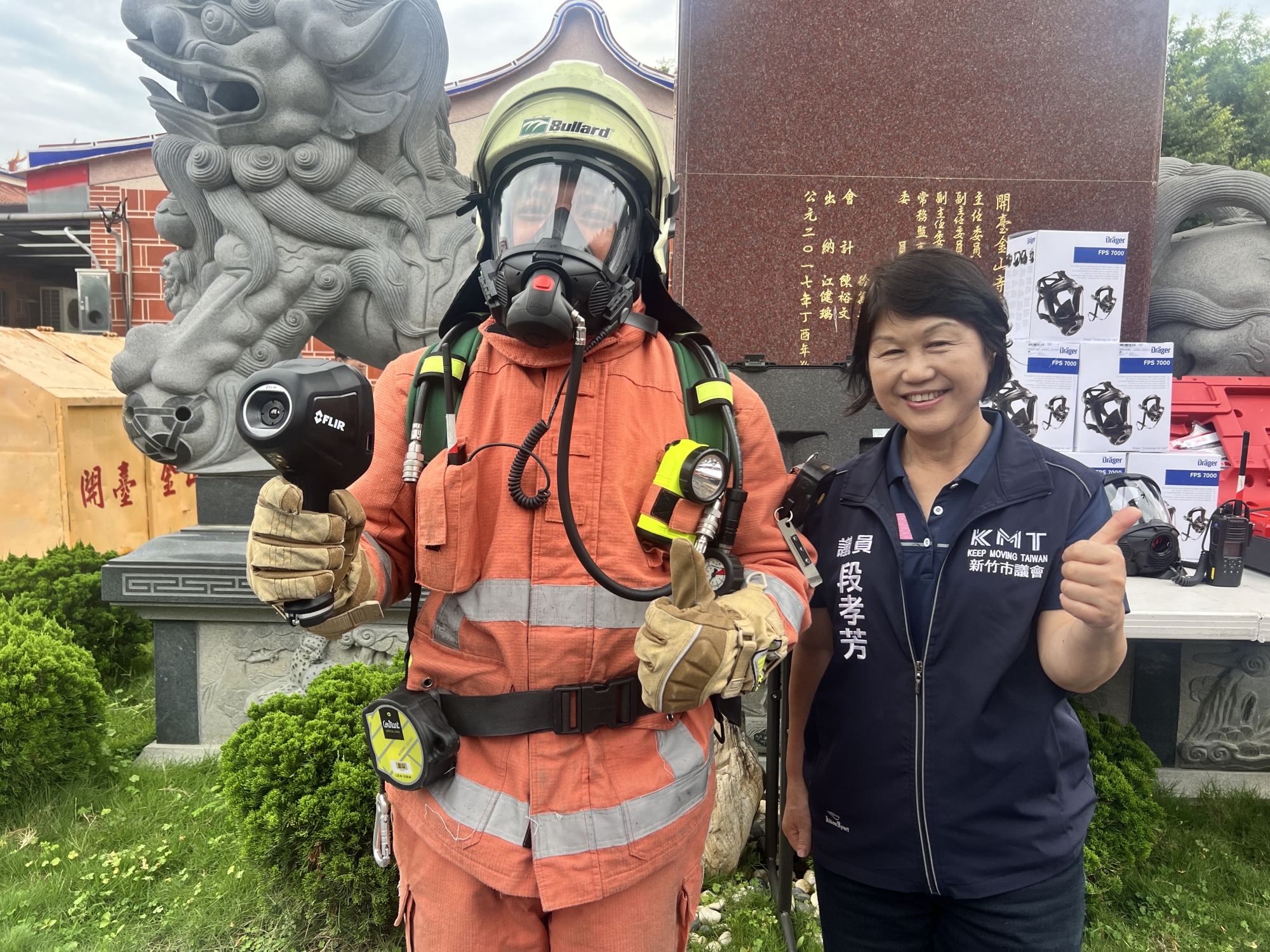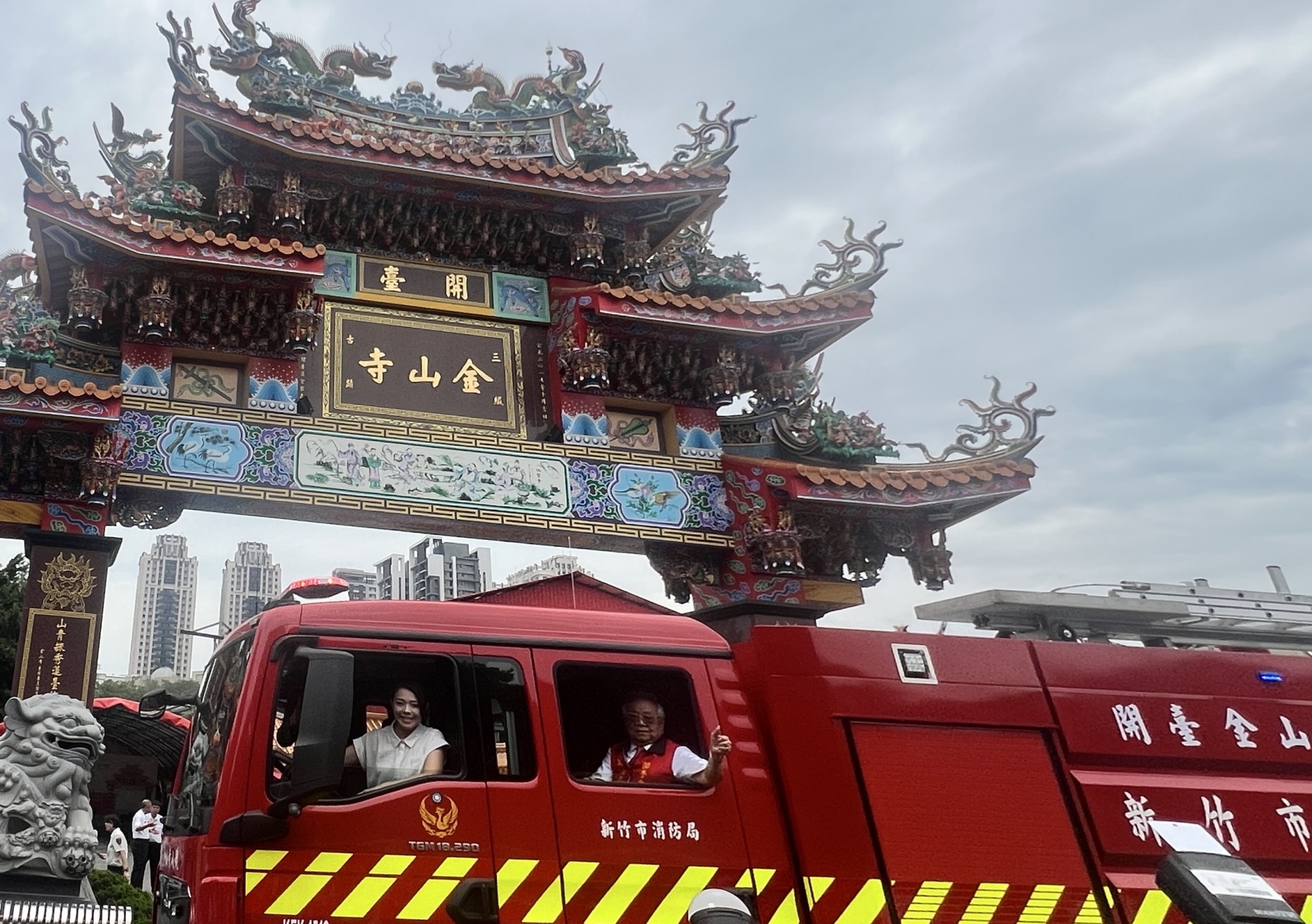 竹市開臺金山寺端午節前夕,捐贈兩千萬多功能化學消防車,今(25)日由竹市長高虹安親自主持啟用儀式代表受贈,回贈感謝狀與化學車紀念模型,感謝金山寺主委饒圳榮及委員們熱心公益,協助守護新竹市民安全,讓竹市救災能量再升級。