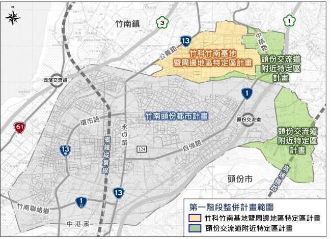 為整合苗北都市空間及引導規劃發展藍圖,縣府先就都市計畫層級與權管單位相同的「新竹科學園區竹南基地暨周邊地區特定區」及「高速公路頭份交流道附近特定區」二處特定區辦理第一階段之計畫區整併,整併為「竹南科學園區暨周邊地區特定區主要計畫」=.