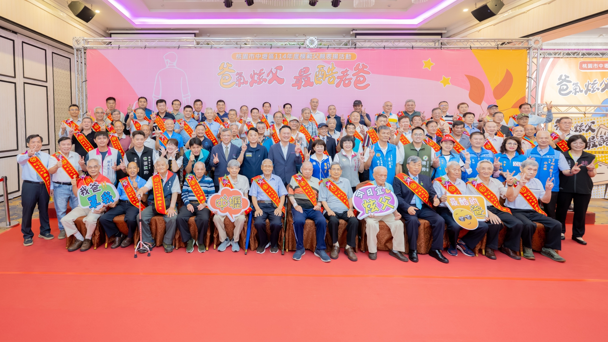 桃園中壢區今年活動以「爸氣炫父 最酷老爸」為主題,盼能打破傳統父親嚴肅、沉默的刻板印象,展現父愛更多元、溫暖與時尚的一面。今年中壢區共有79位模範父親接受表揚。