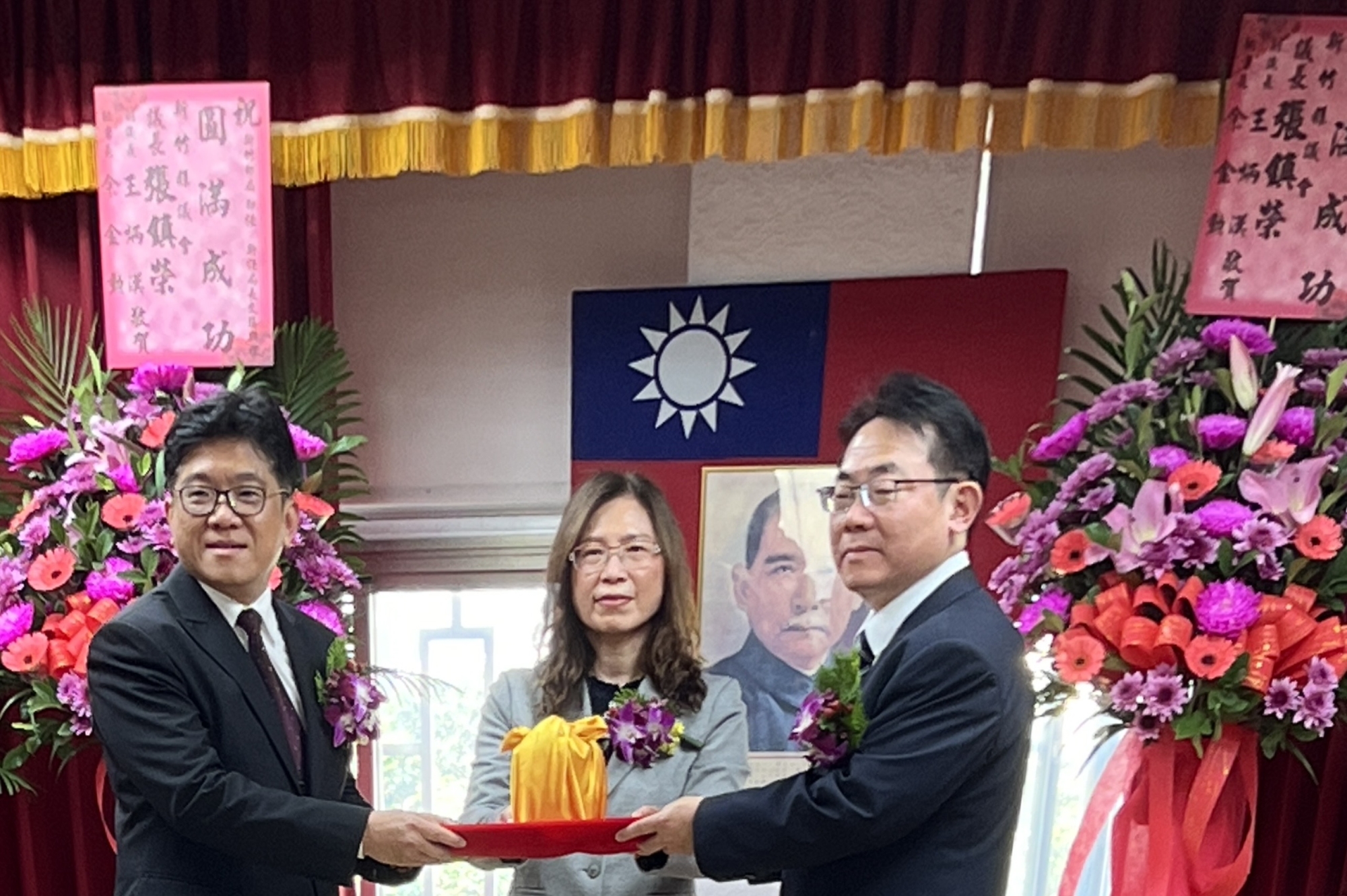 吳進益(左)和沈佛龍(右)交接背景竹縣議長張鎮榮花籃最亮眼 何高祿攝