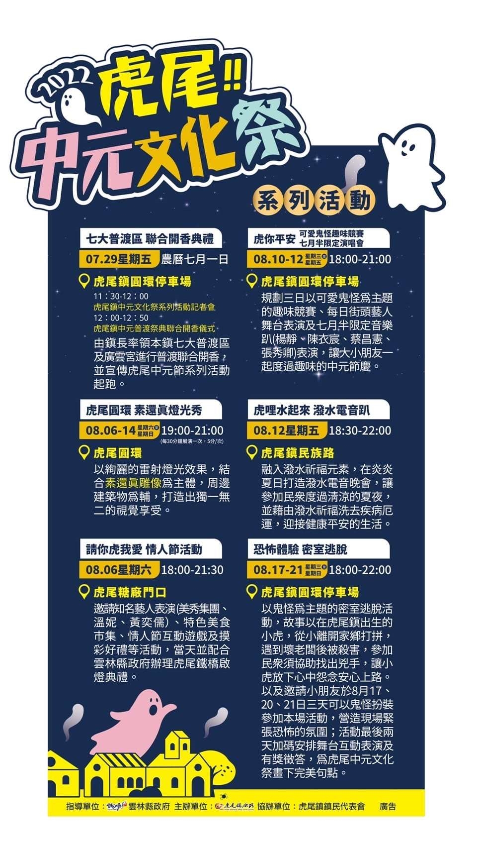 虎尾中元文化祭強勢回歸 恐怖體驗密室逃脫號召全台勇士來挑戰說到中元節最具傳統與熱鬧的祭典活動,不得不提到虎尾的「街仔普」,因為疫情停辦兩年的「虎尾中元文化祭」將在8/10到8/12熱鬧復辦,系列活動更是一波接一波,在8/6由素還真圓環燈光秀、「請你虎我愛」情人節活動打頭陣,將邀請美秀集團、溫妮、黃奕儒唱歌給你聽,8/10-8/12的街仔普,將推出以可愛鬼怪為主題的趣味競賽、並由蔡昌憲、張秀卿等藝人帶來七月半限定音樂趴,另外將在8/12加碼推出的潑水電音趴,不止清涼消暑還能藉由潑水祈福洗去疾病厄運!