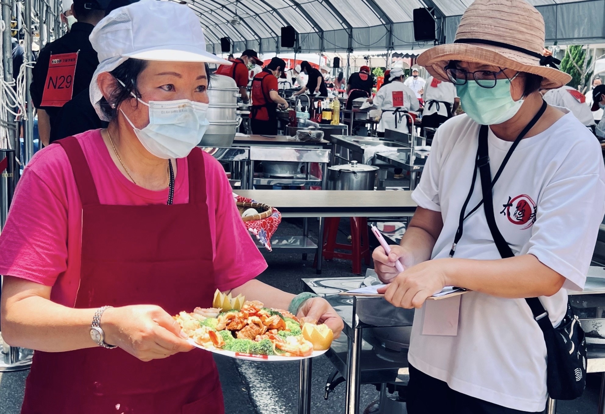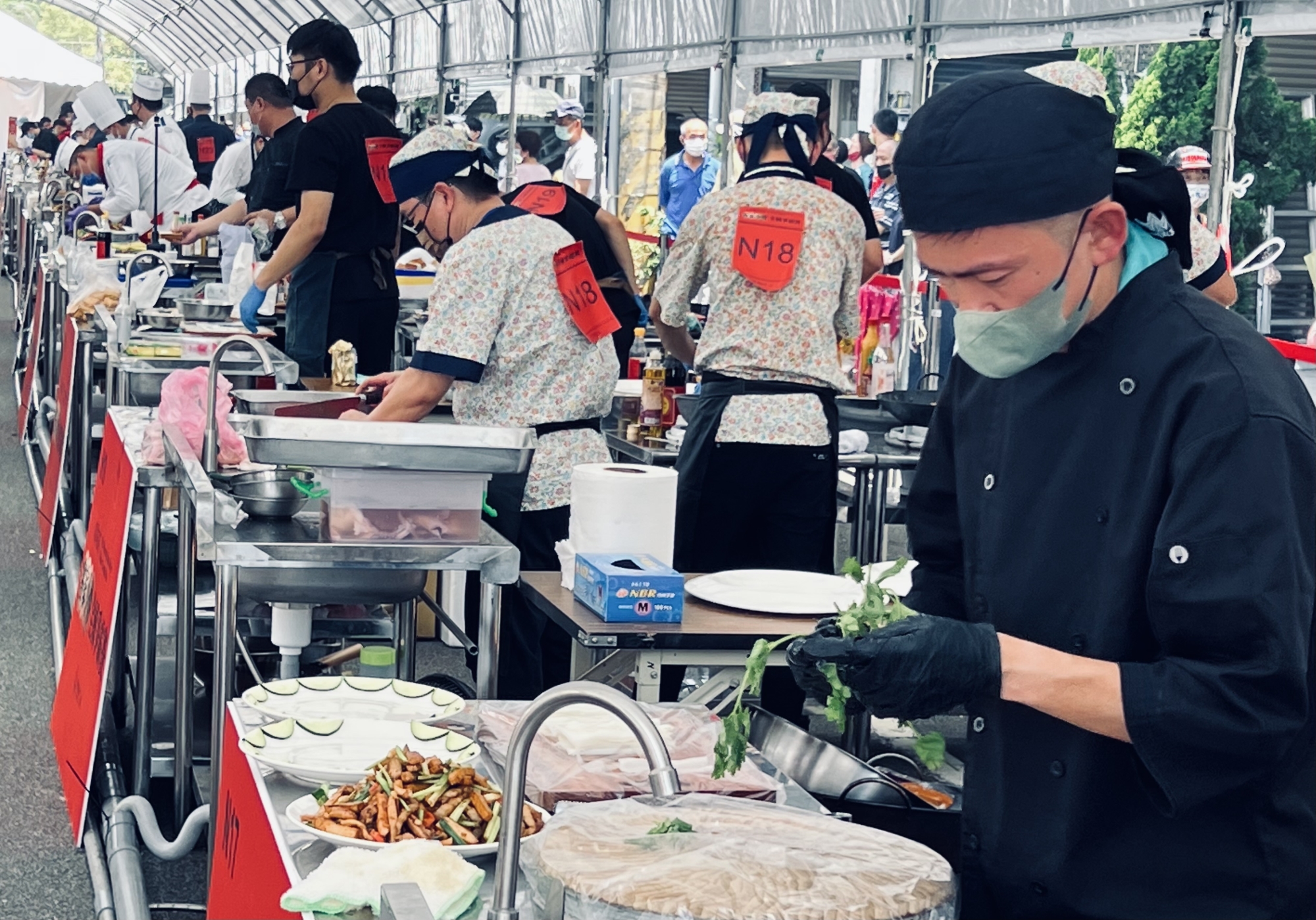 競賽現場氣味最濃的是芹菜,次為大蒜和蒜苗,參加競賽隊伍服裝不一,有黑、有白也有黃,有人穿著制式廚師服,有人一付輕鬆打扮,有人神情緊張奪名心切,有人抱持學習態度,輕鬆愉快東張西望,利用機會學工夫。