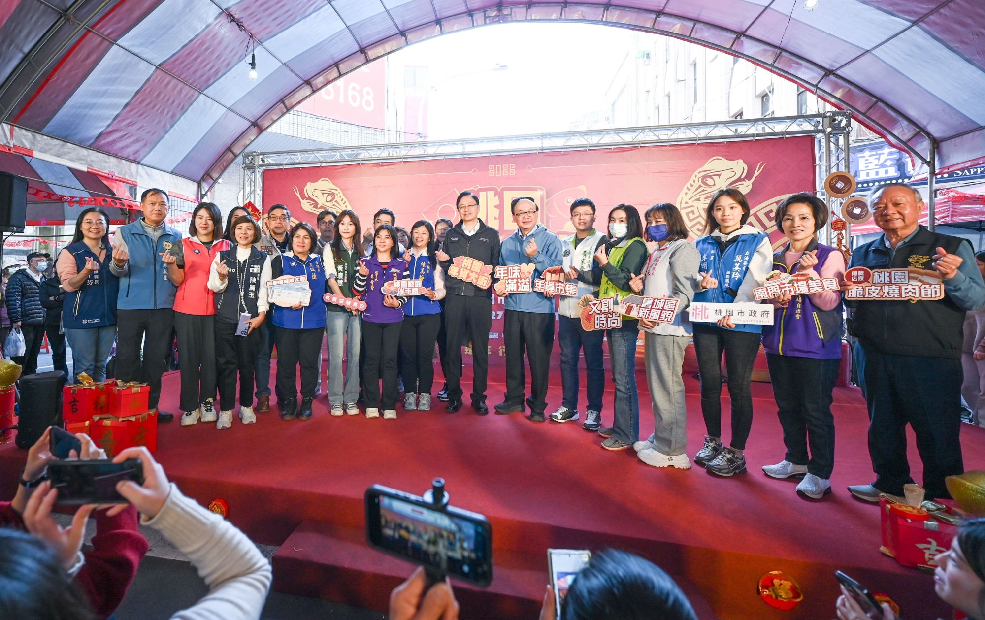 桃園市長張善政,今(14)日下午前往桃園區,出席「2025桃園年貨大街」開幕記者會表示,桃園南門市場交通便利,更鄰近景福宮及慈護宮等廟宇,向來是市民採買年貨首選,今(114)年特別規劃自即日起至27日為期兩週,於南門市場旁的南華街集結80家精選店家與攤商,展現桃園最優質的年貨商品,包括紅燒蹄膀、脆皮燒肉、豬肉乾等應景美食,讓市民朋友可以一站購足,期盼未來每年皆能持續辦理,與在地店家共同打造南華街成為桃園最具代表性的年貨大街。