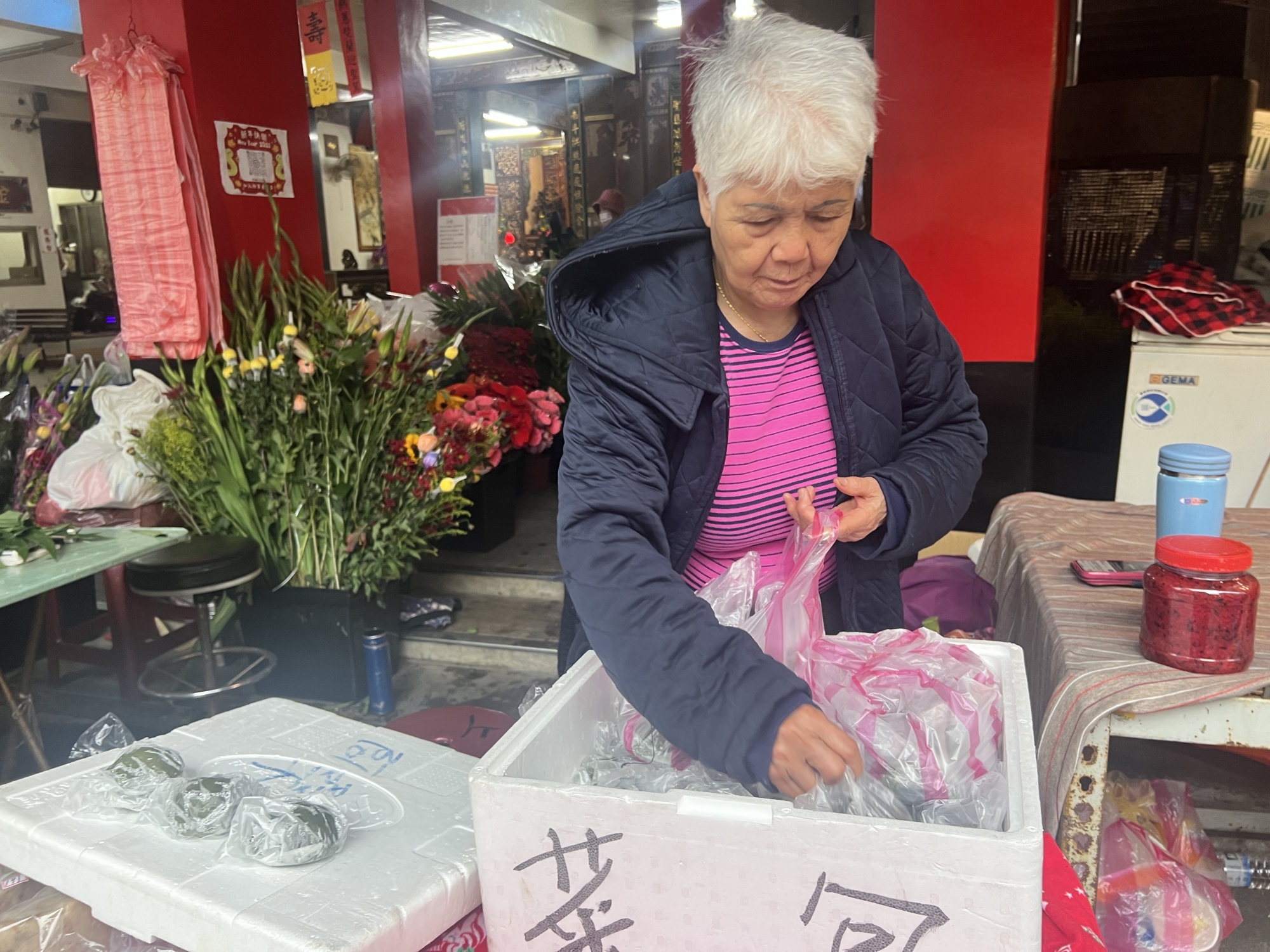 實在和原味,讓每天早上六、七點鐘,在竹蓮市場大眾廟前,小攤子上賣大肚菜包的包媽媽,生意應接不暇,兩三個鐘頭就收攤打烊。清明節前夕生意更是忙碌,有些預定一次即買走幾十個,收工時間更快。