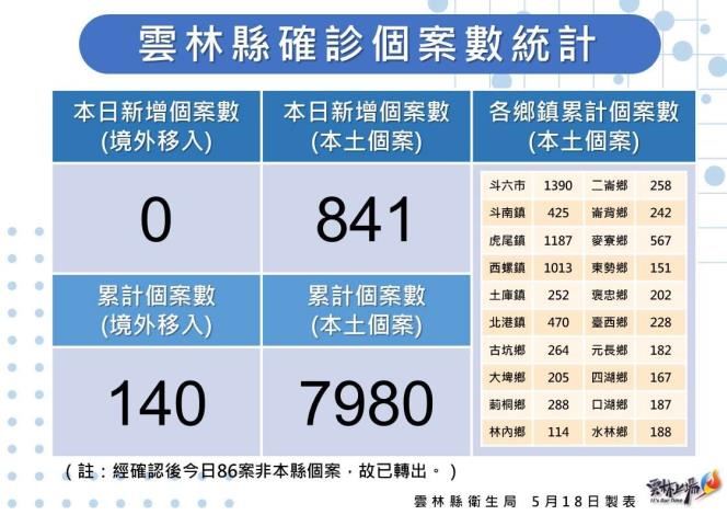 (記者 張昆煌/雲林報導)雲林縣今日(5/18)日新增 841 例本土確診個案, 確診者分別為斗六 164 例,虎尾 118 例,西螺 82 例,麥寮 61 例,斗南 44 例,北港 41 例,古坑 38 例,莿桐 31 例,崙背及元長各 30 例,二 崙及台西各 29 例,口湖 28 例,大埤 24 例,土庫 23 例,水林 18 例,褒忠及四湖 各 16 例,林內 10 例,東勢 9 例個案。